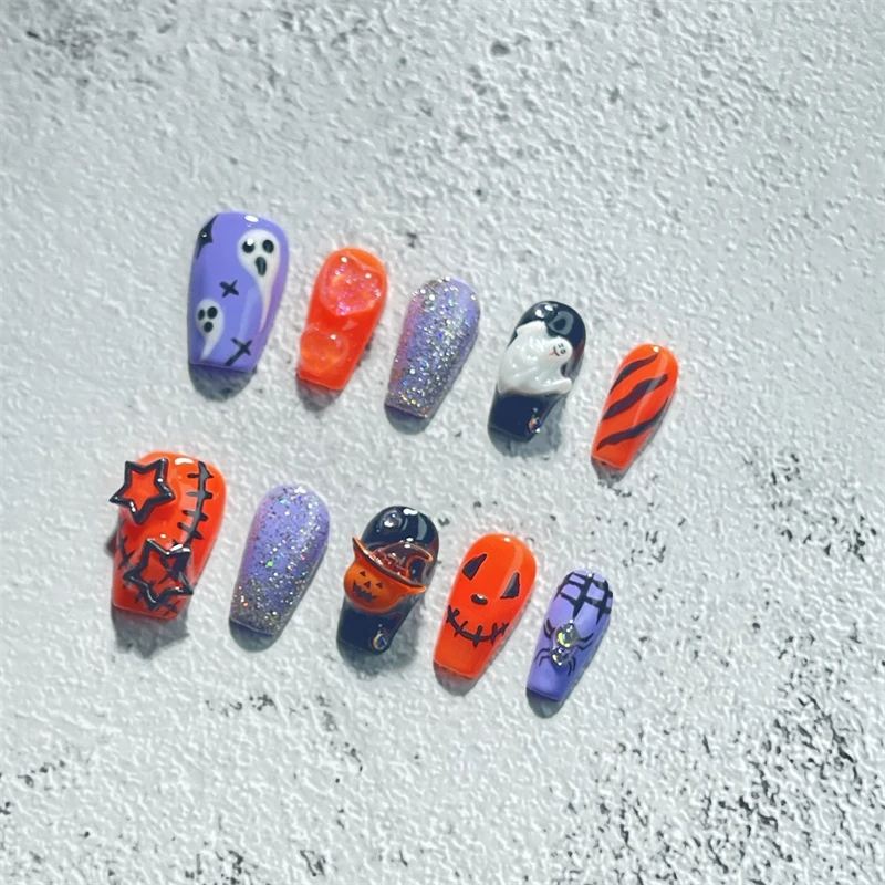 Qfdian Halloween Handmade Press on Nails y2k Pumpkin Full Cover Fake Nails Spice Girls Glitter Wearable Nail Tips Manicure Mixing Color