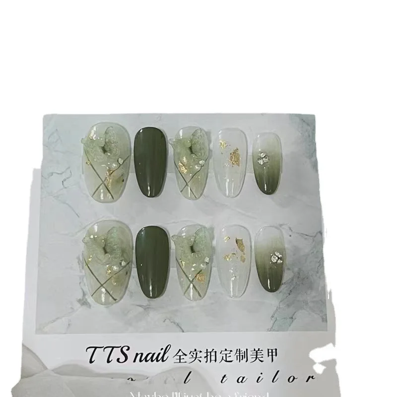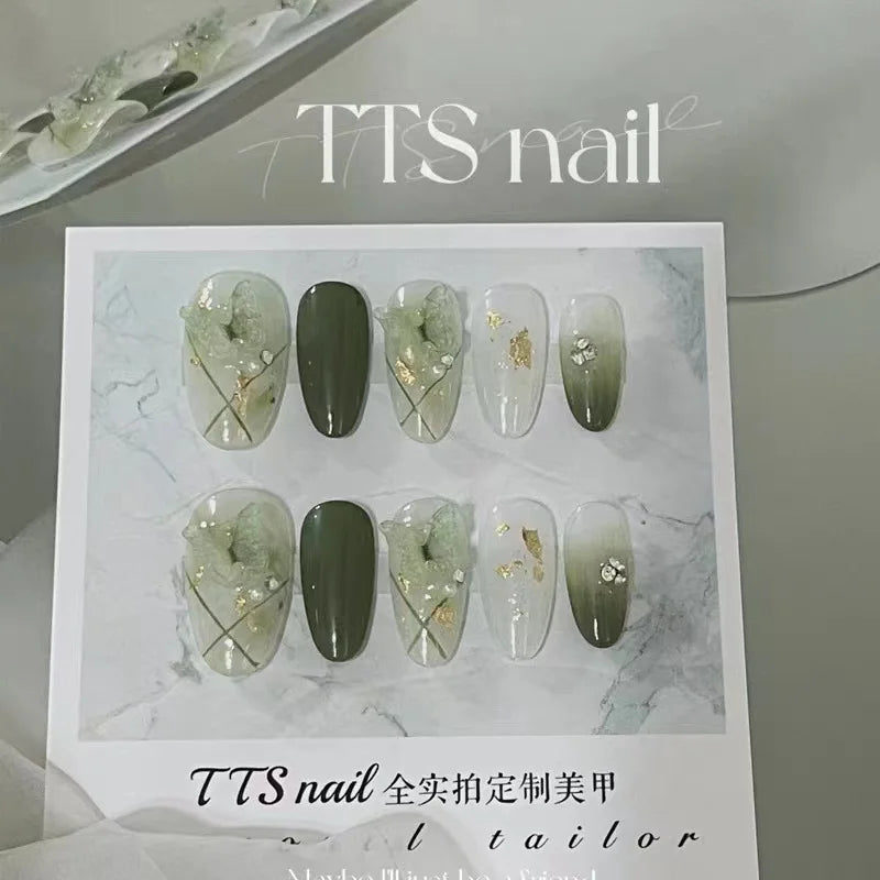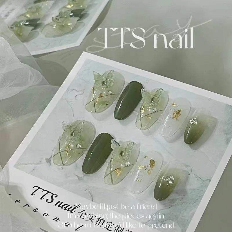 Handmade 3D Green Fairy Almond Press on Nails with Glue Fake Nail Gradient Butterfly Reusable Artifical Full Cover Nail Tips Art
