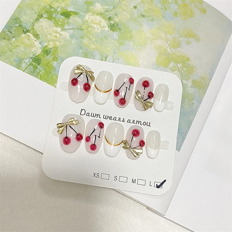 Qfdian Handmade Cute Press On Nails Short Oval Cherry Artificial Fake Nails Bowknot French Summer False Nails Charms Manicure Design