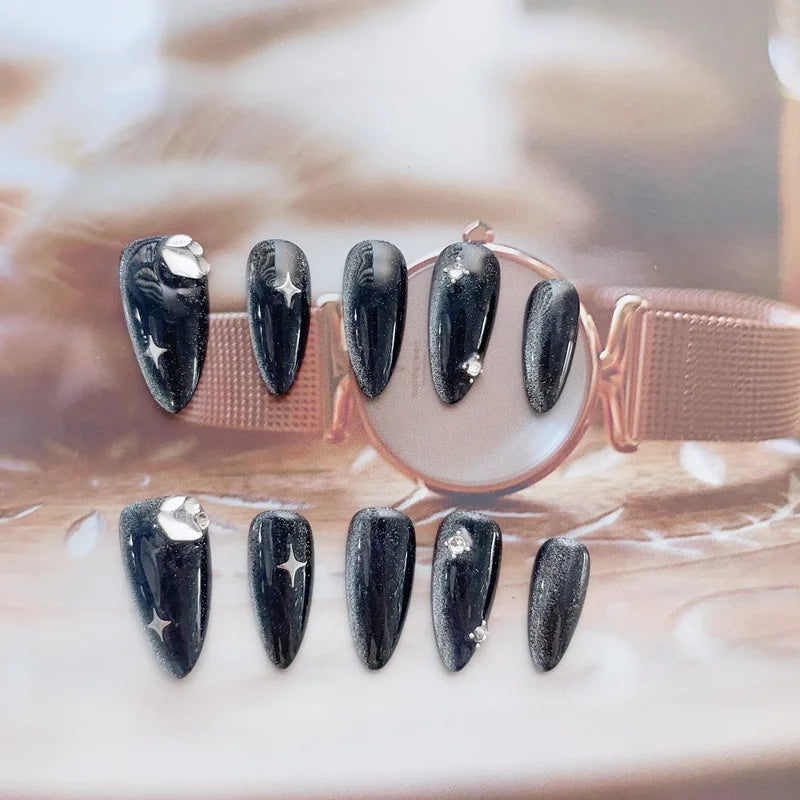 Qfdian Handmade False Nails Press on Dark Star Cat's Eye Almond Fake Nails Acrylic Full Cover Nail Tips Glitter Nails Set with Designed