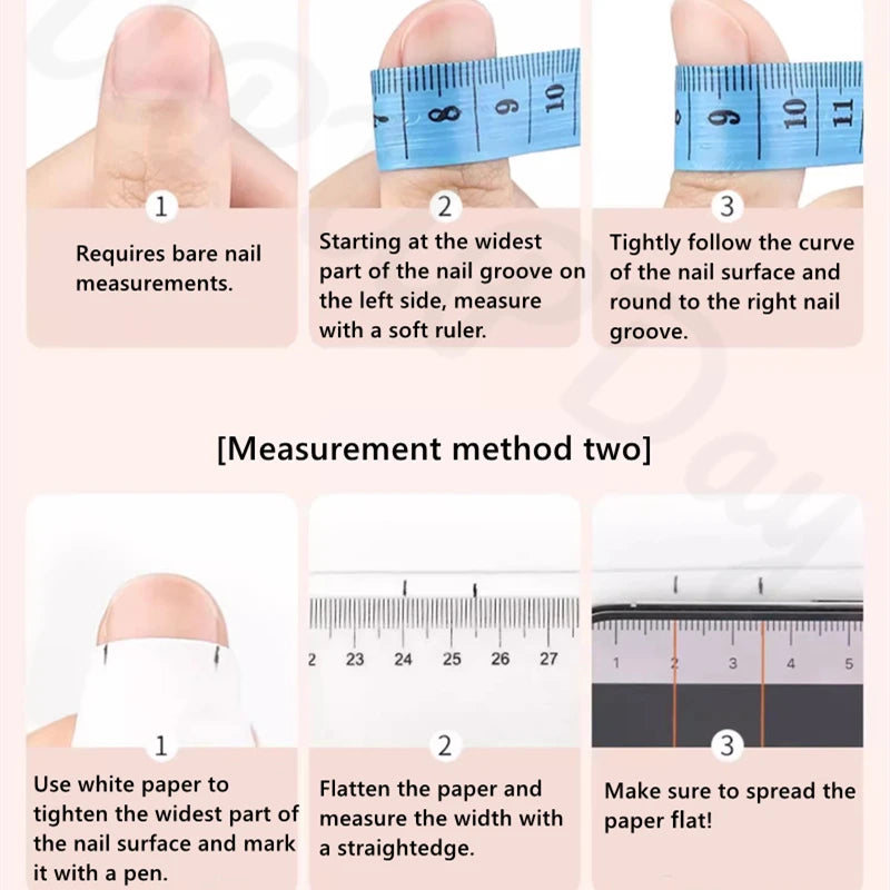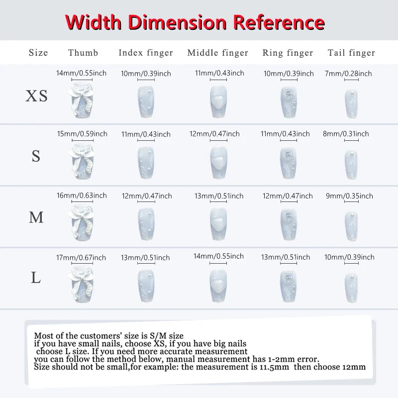 Nail size selection tips:Generally select XS size for small nails, S size and M size for normal fingers, and L size for large nails. If you want a standard point, please measure it according to the method we provide. Size should not be small, for example: the measurement is 11.5 mm then choose 12 mm.
