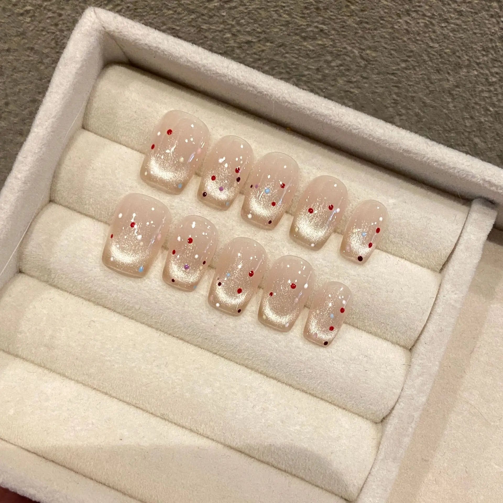 Handmade French Short Champagne Cat Eyes Fake Nails Press on Nails Polka Dot Designs Full Cover False Nails Tips for Women