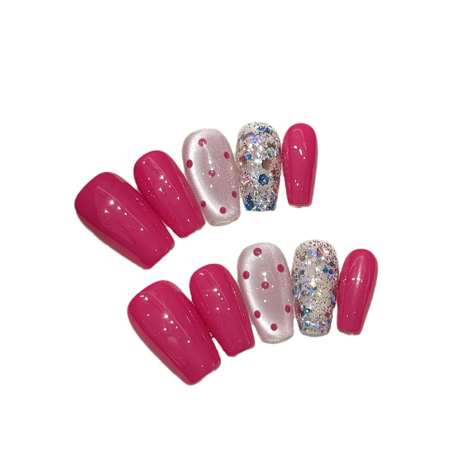 Qfdian Handmade Press On Nails Flash Glossy Red Cat's Eye False Nail Tips With Glitter Wave Point Designs Short Wearable Fake Nail