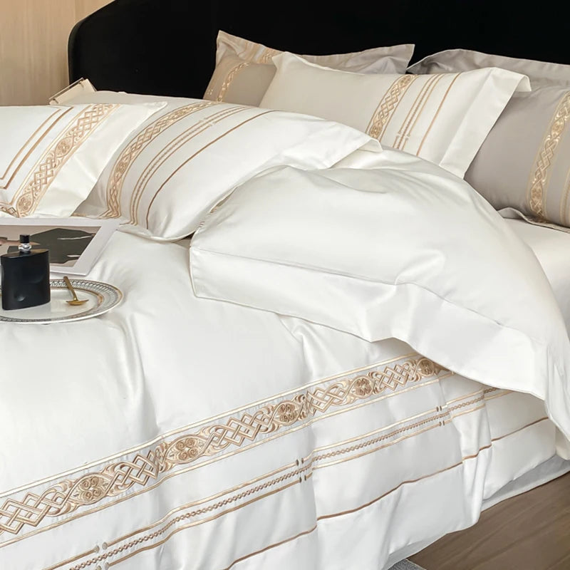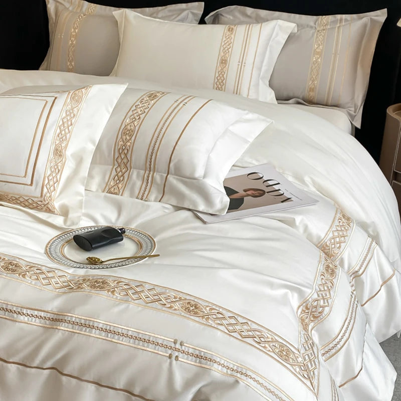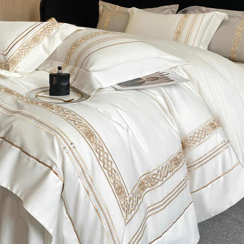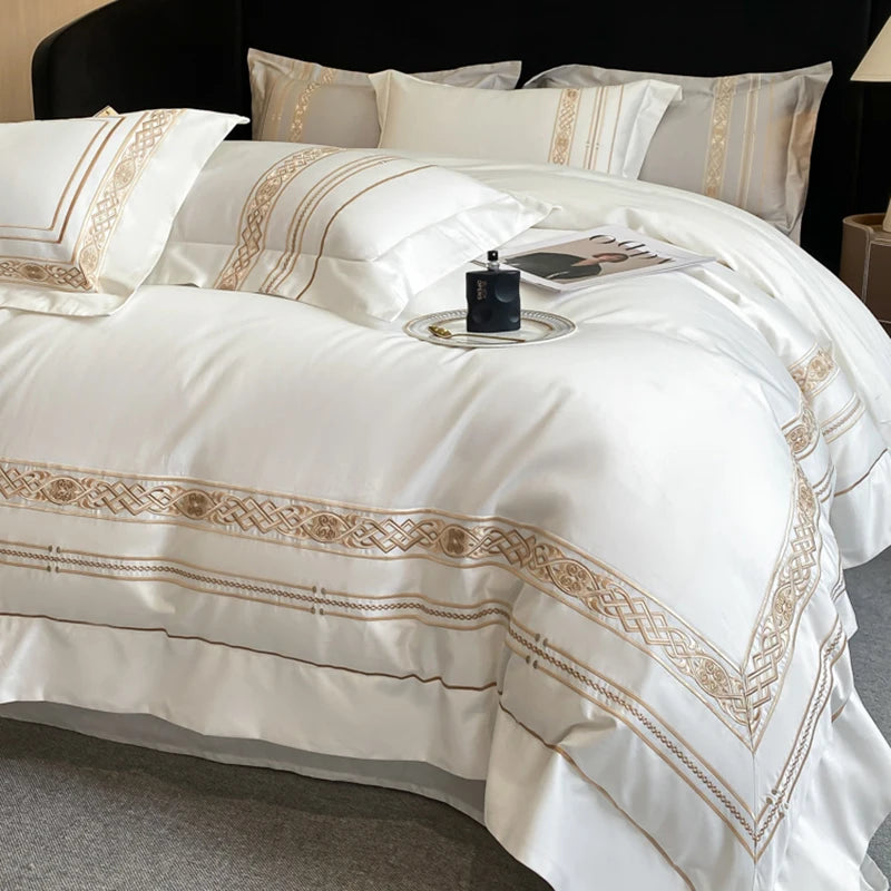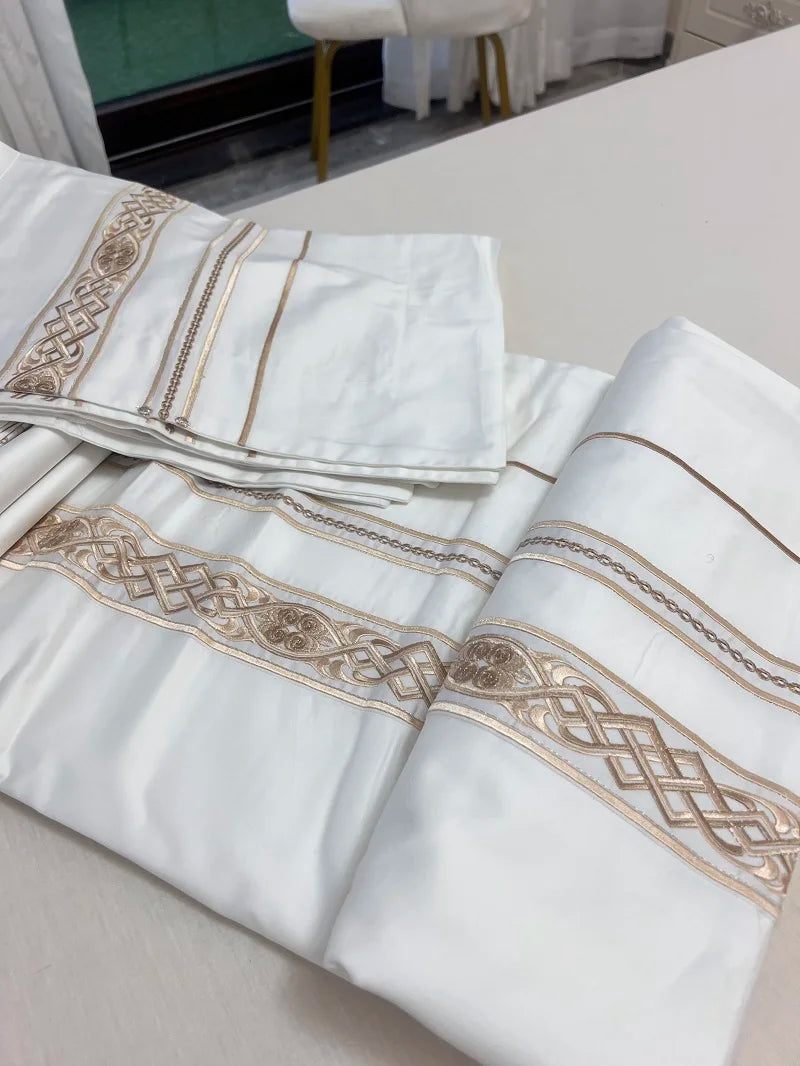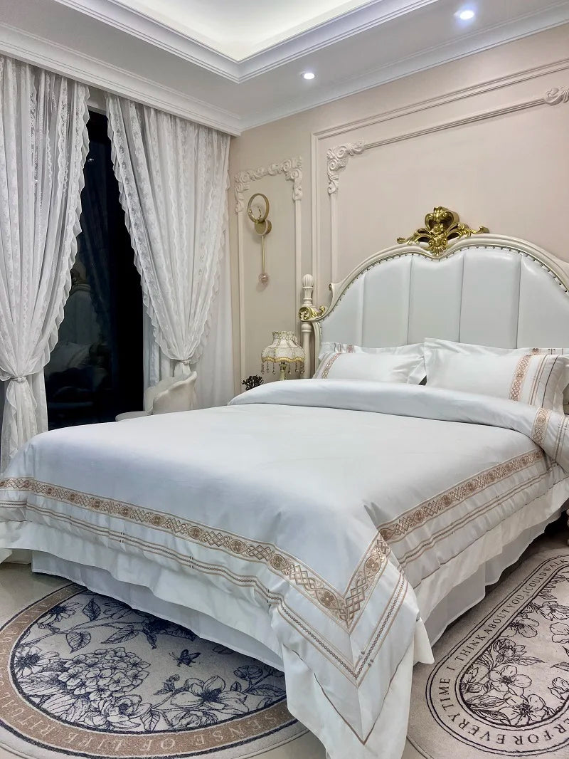 Qfdian Hotel Style Bedding Set Luxury 100% Egyptian Cotton Gold Embroidery White Duvet Cover Or Elastic Band Fitted Sheet Pillowcases