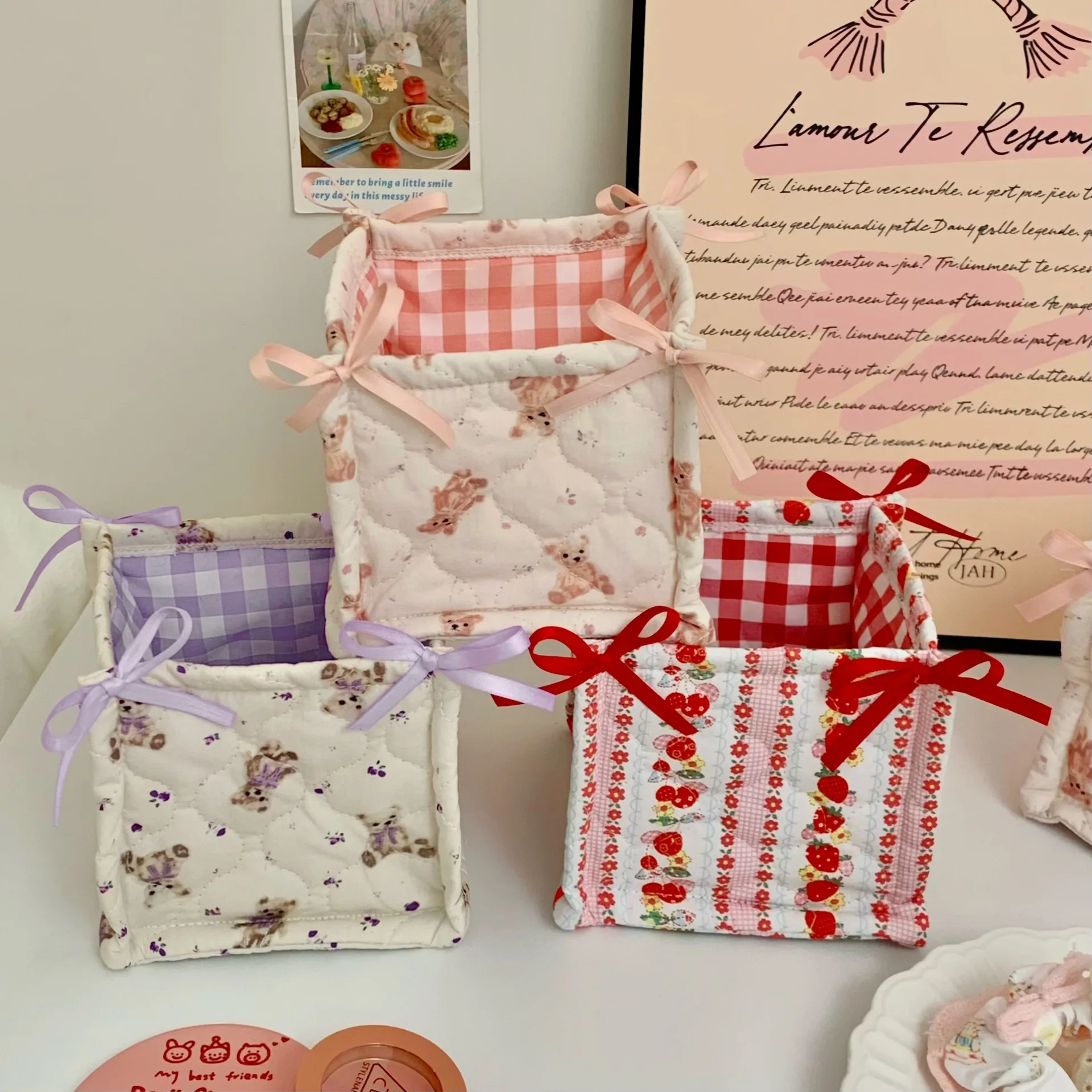 Qfdian Ins Style Cute Quilted Storage Basket Desktop Storage Basket Storage Box Cosmetics Snacks Small Sundries Organizing Bag