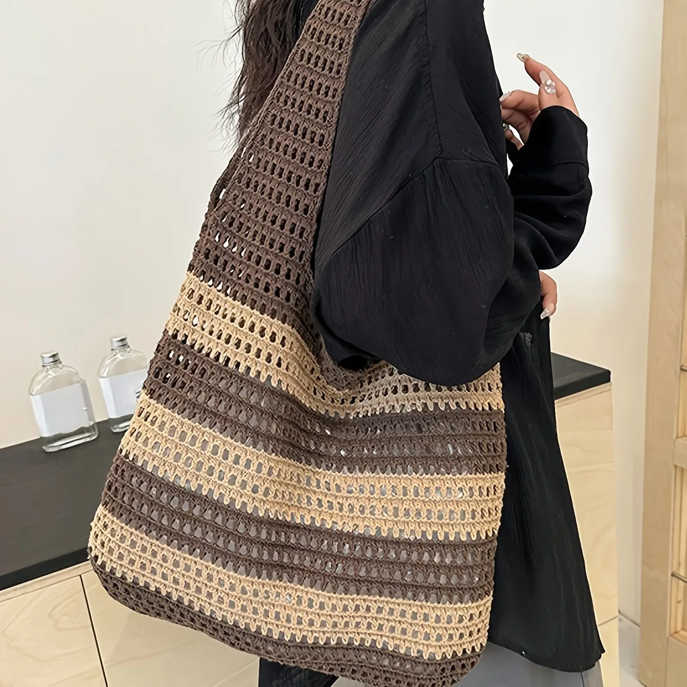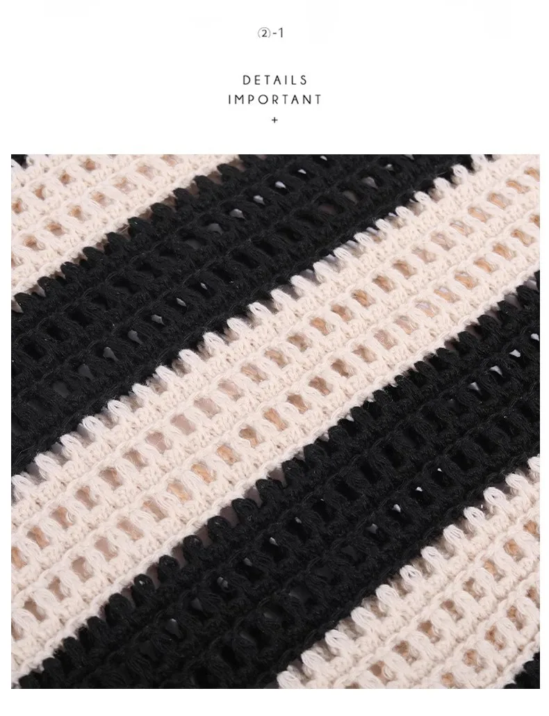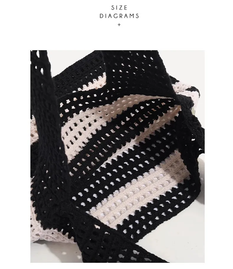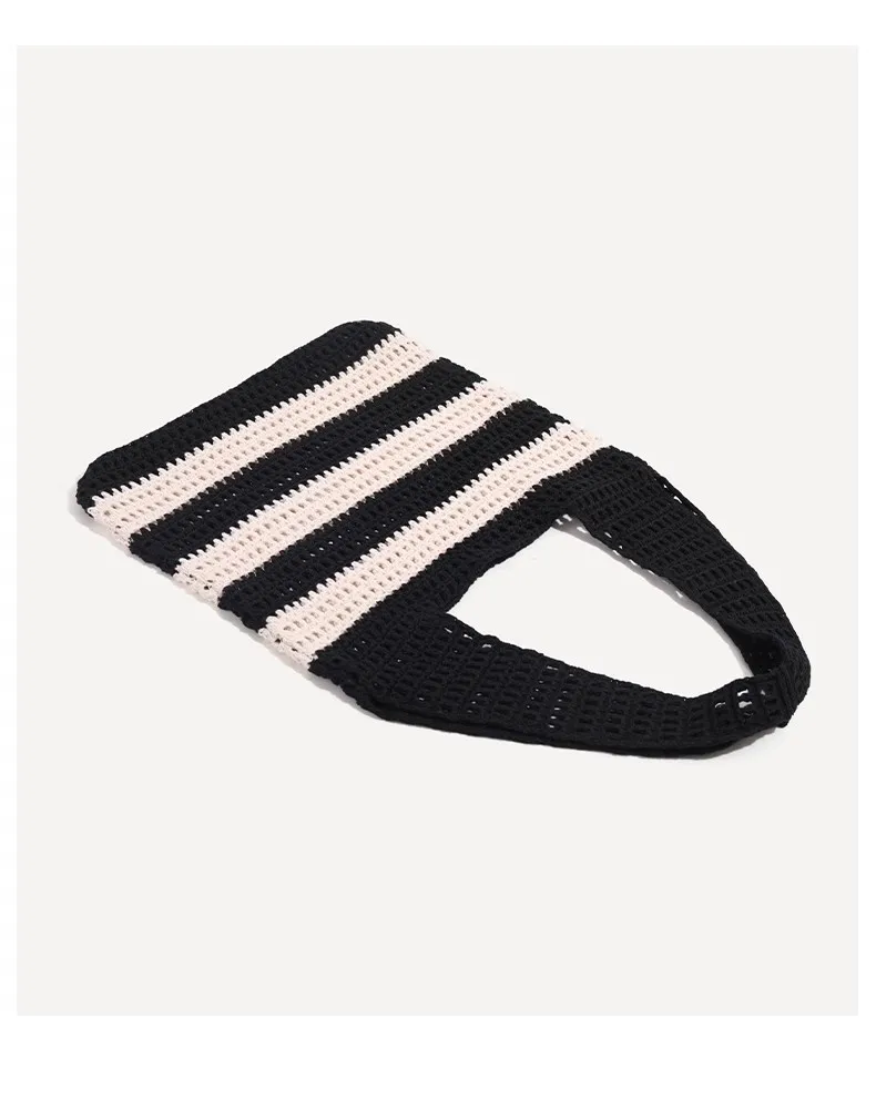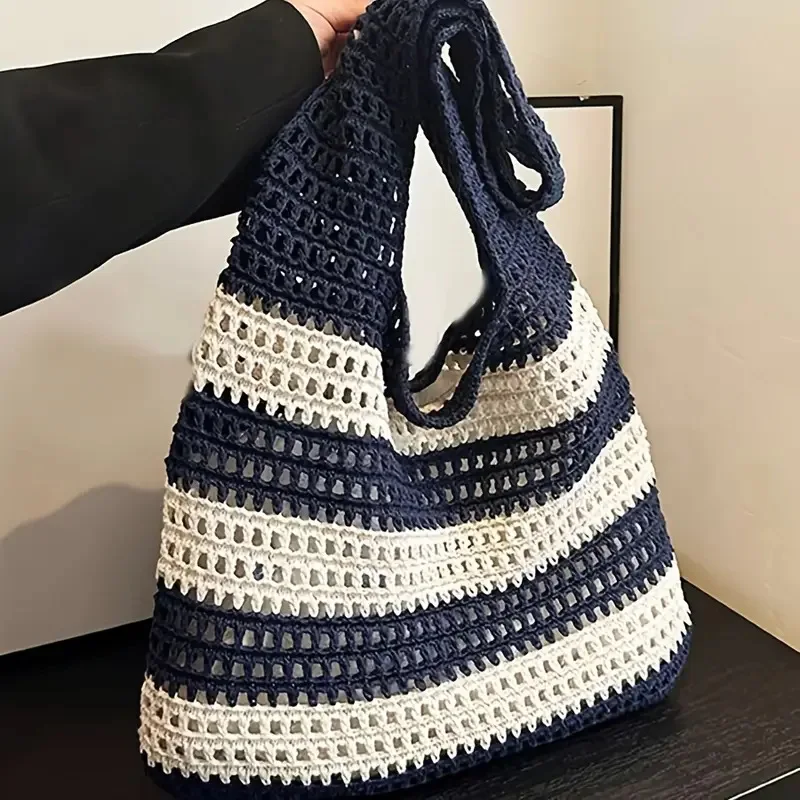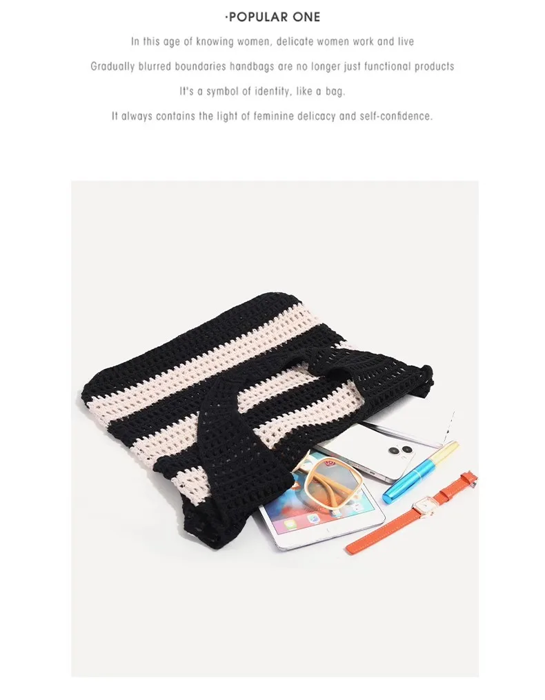 Qfdian Ladies' woven bag, niche design, striped knitted bag, simple hollow out hand-held shoulder bag, sports handbag