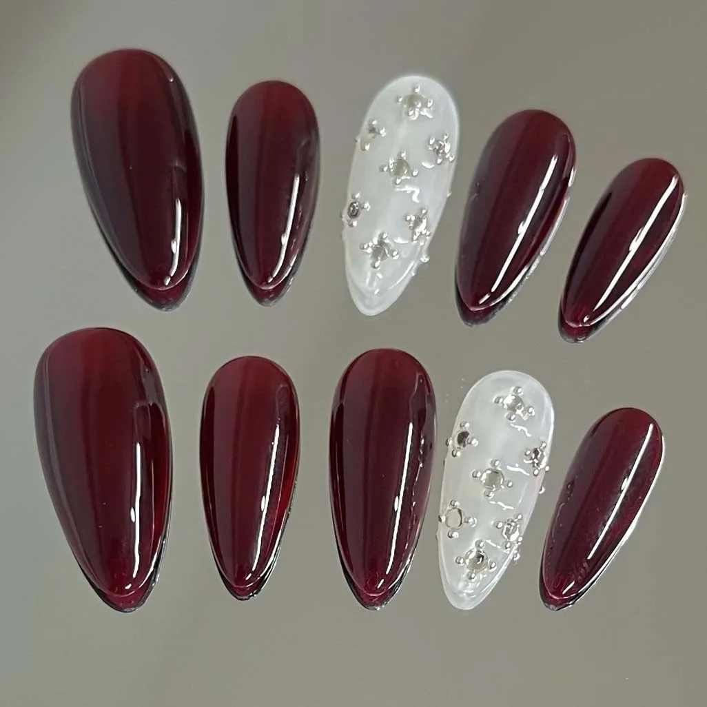 Qfdian Luxury Handmade Almond Press on Nails Vintage Red Diamond Design Reusable False Nails Acrylic Full Cover Nail Tips Nail Art