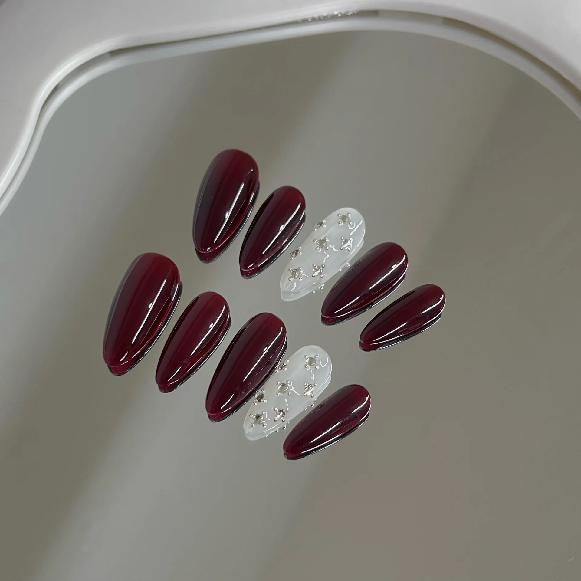 Luxury Handmade Almond Press on Nails Vintage Red Diamond Design Reusable False Nails Acrylic Full Cover Nail Tips Nail Art