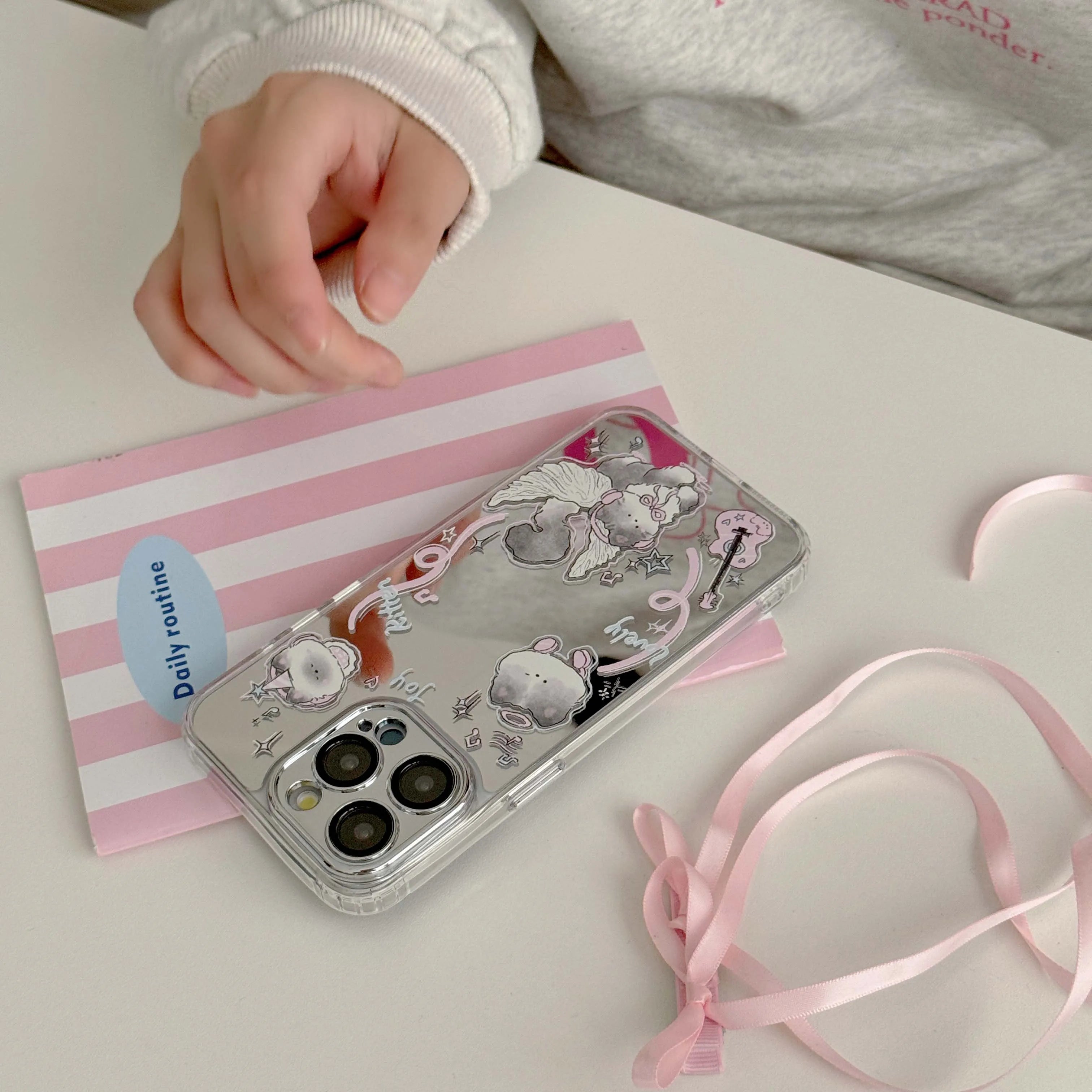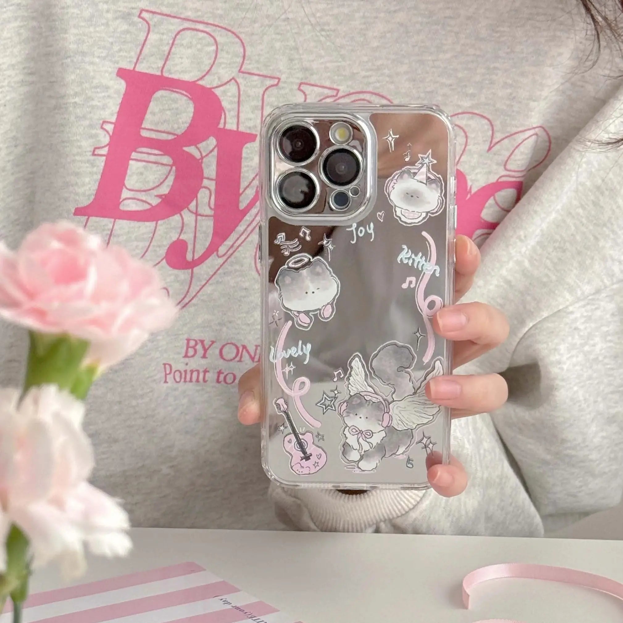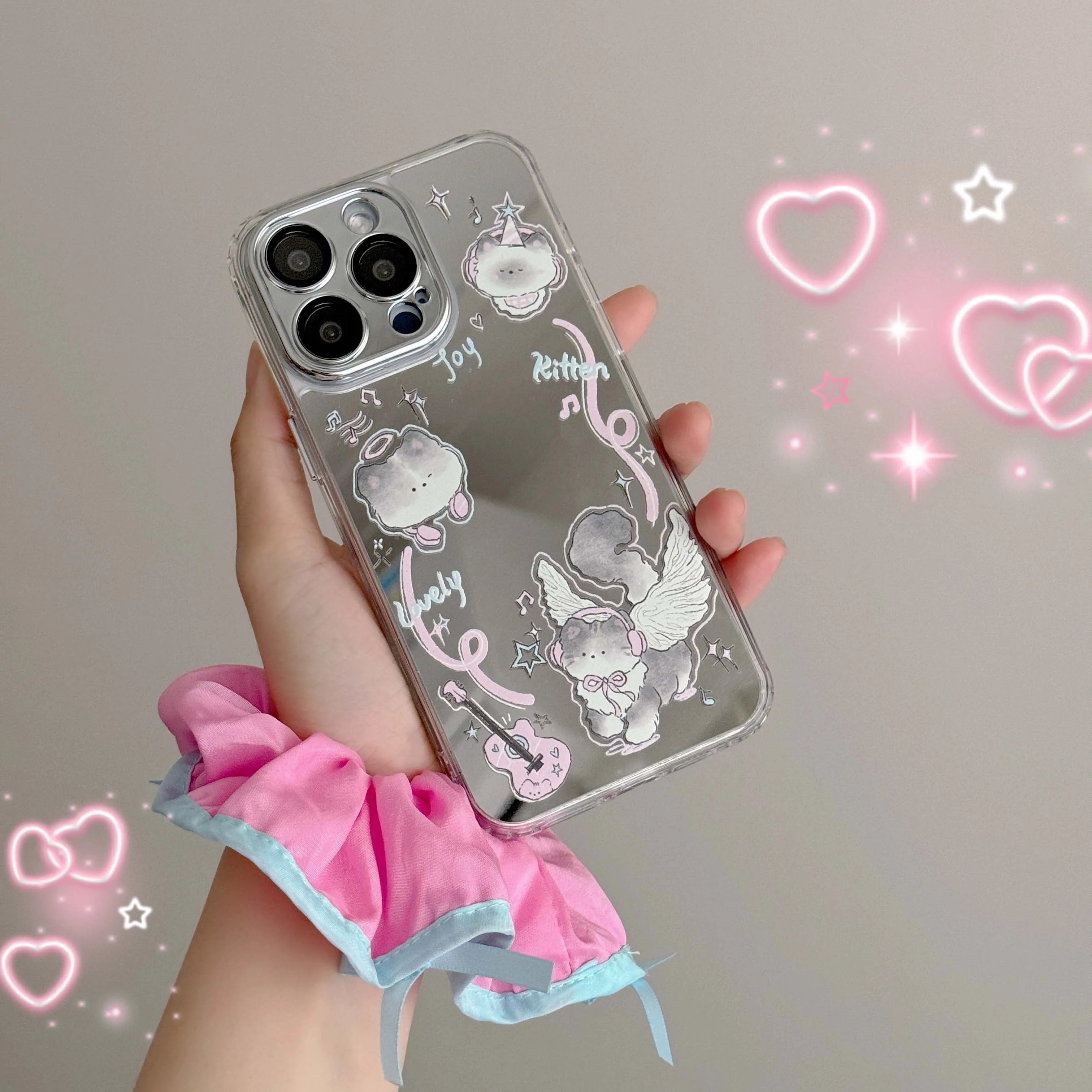 Qfdian Mirror angel cute music cat phone case for iphone 15 13promax 15pro 12promax 13pro 14 13 pro max 12 ins pink guitar fundas