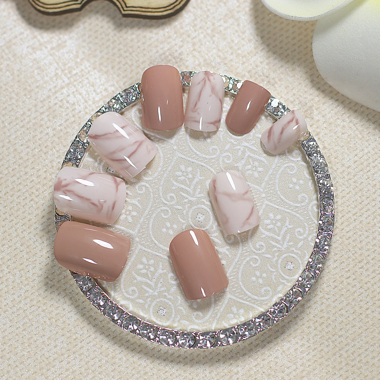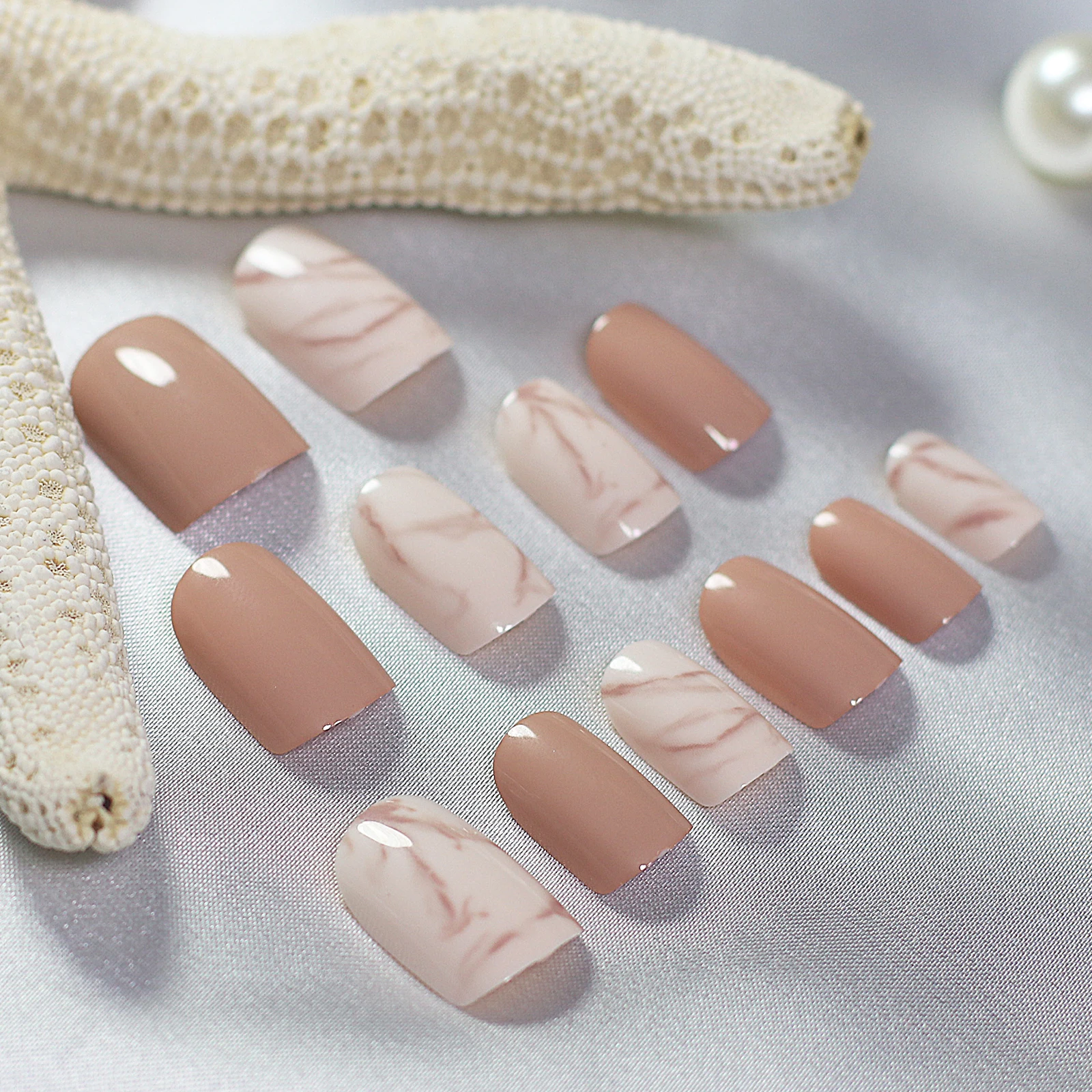 Qfdian Natural Nude Color Press On Nails Marble White Artificial False Nails Square Short Glossy Pattern Tips with Glue Sticker