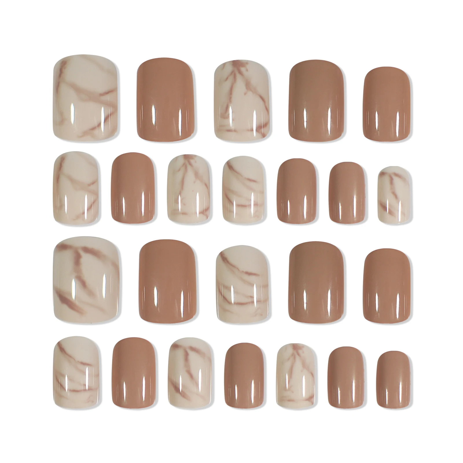 Natural Nude Color Press On Nails Marble White Artificial False Nails Square Short Glossy Pattern Tips with Glue Sticker