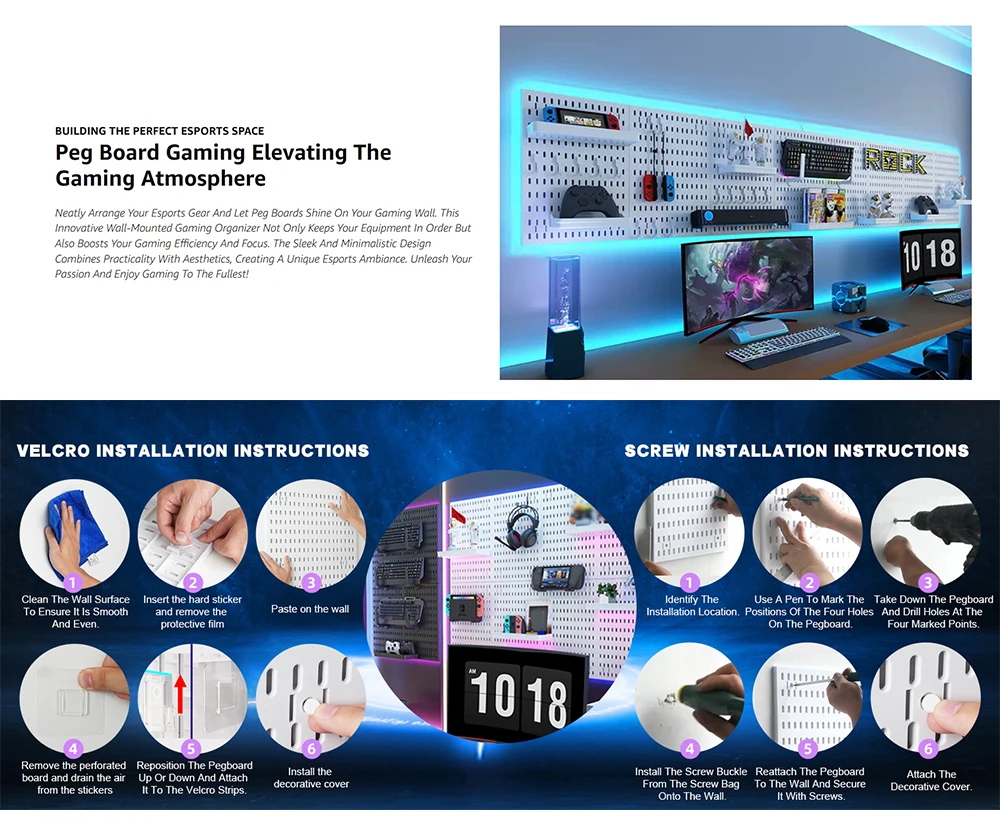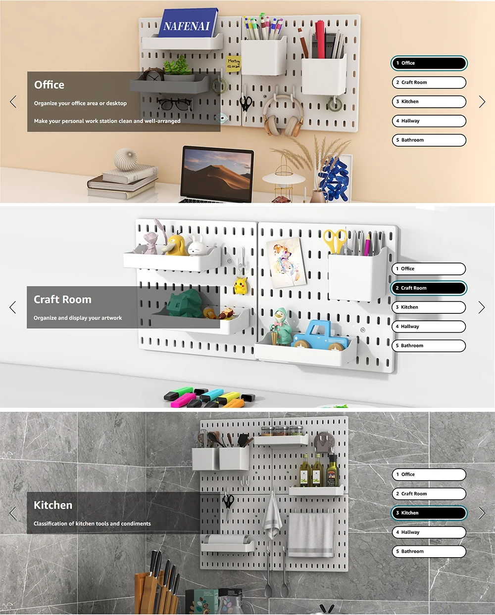【High-quality peg board wall】This pegboard for wall combination kit is made of high-quality ABS,which is durable and has a strong bearing capacity.Each nail board is equipped with 4 non-marking back stickers.