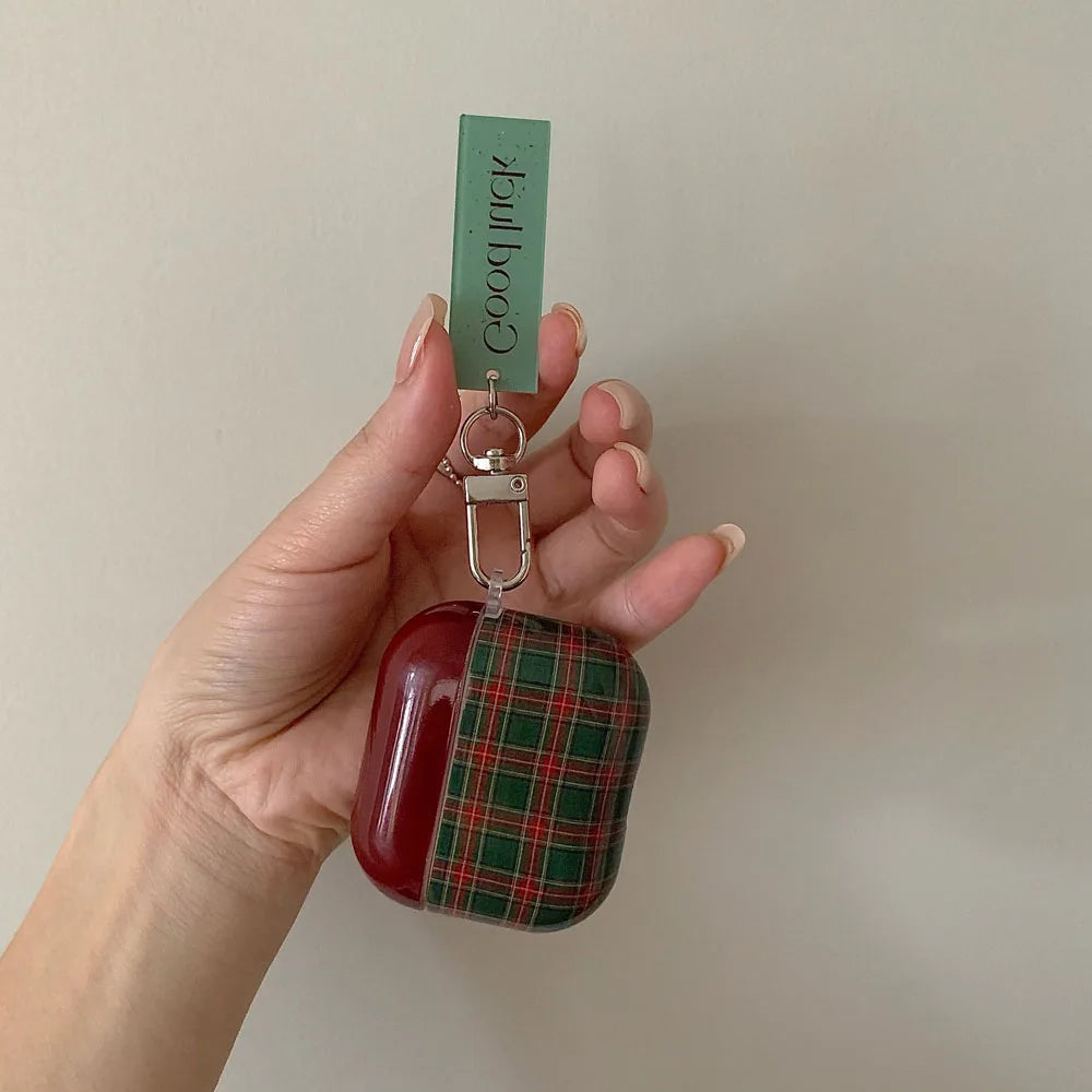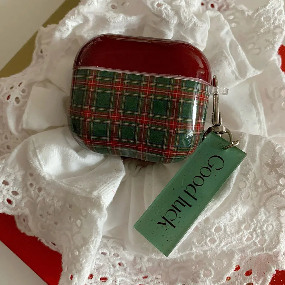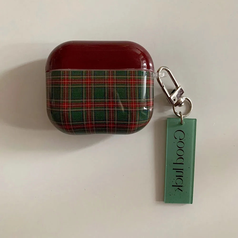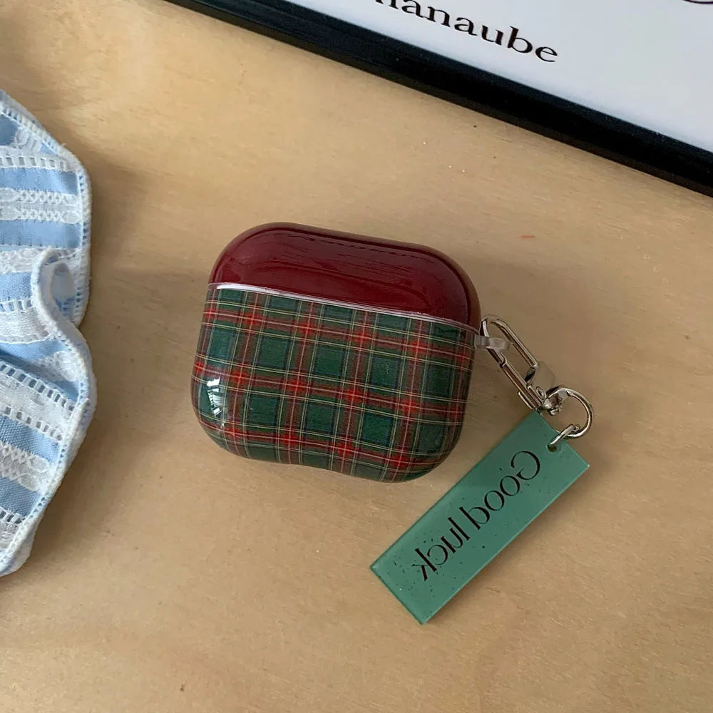 Qfdian Retro Style Grid Pattern Gloss Soft Cover Case for AirPods 4/3/2/1 Pro 2 Wireless Bluetooth Earphone Shell Good Lucky Pendant