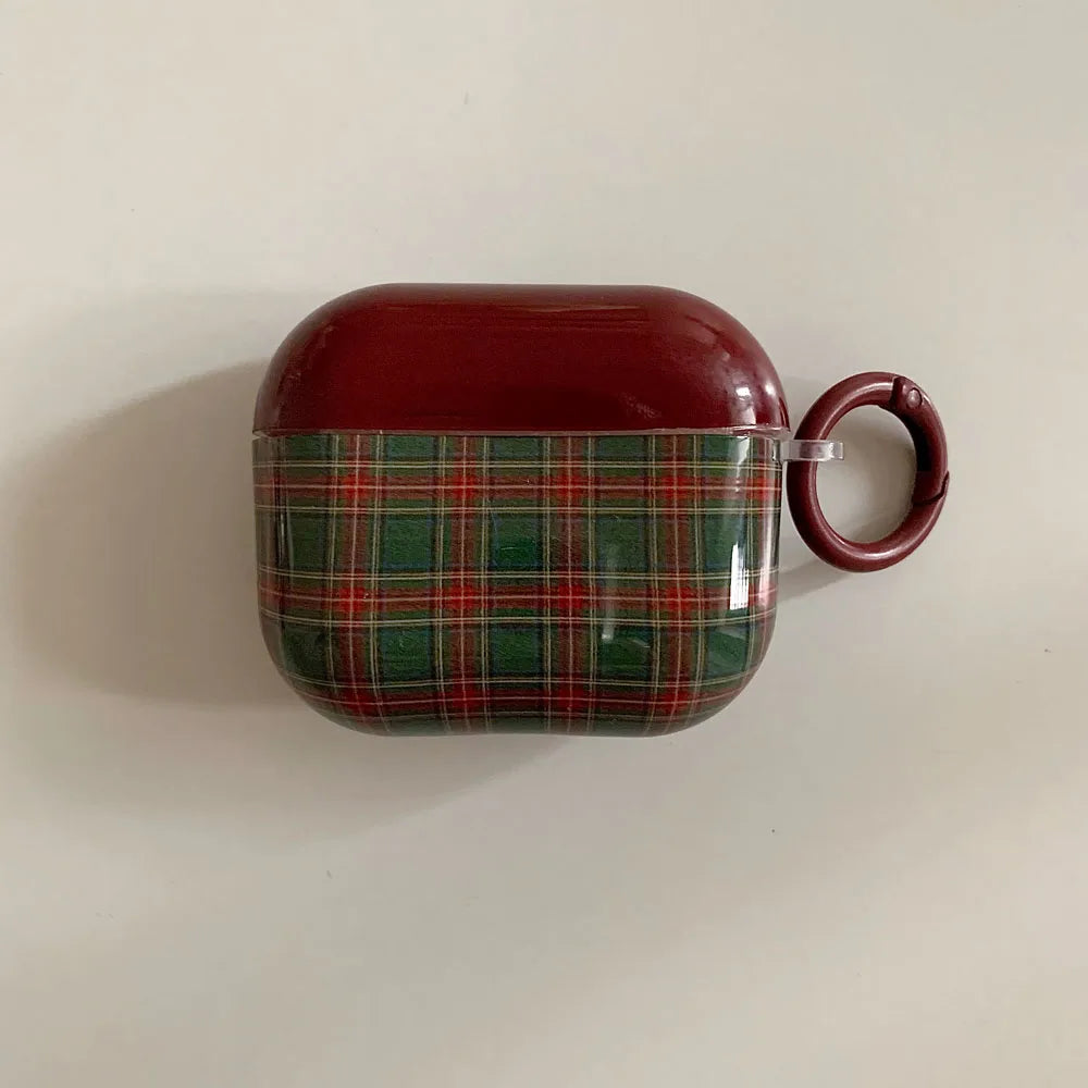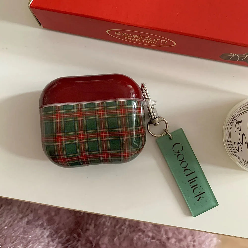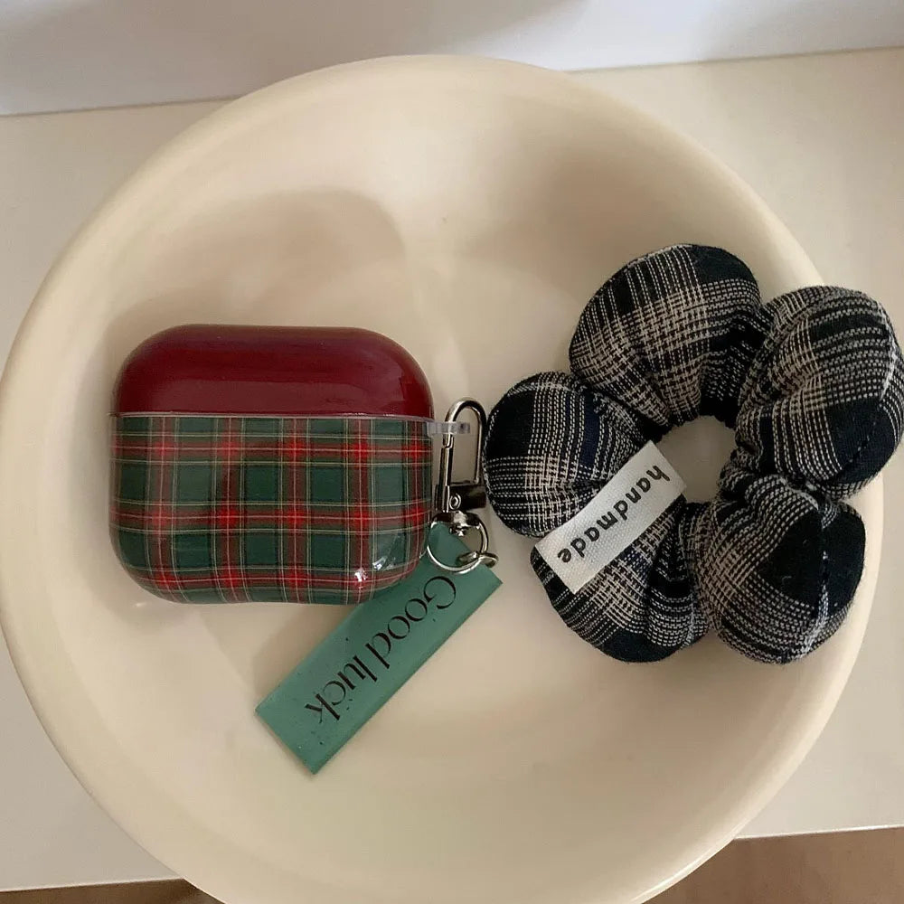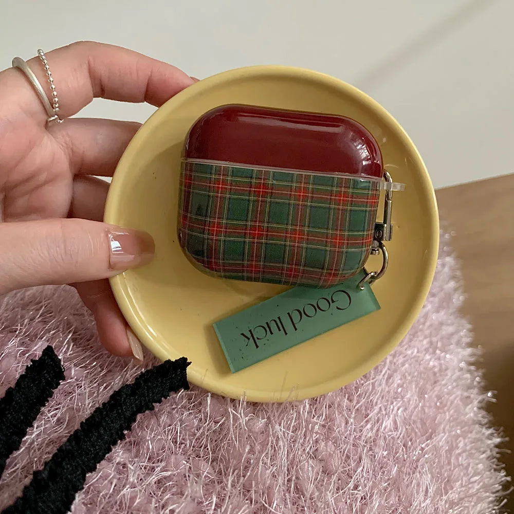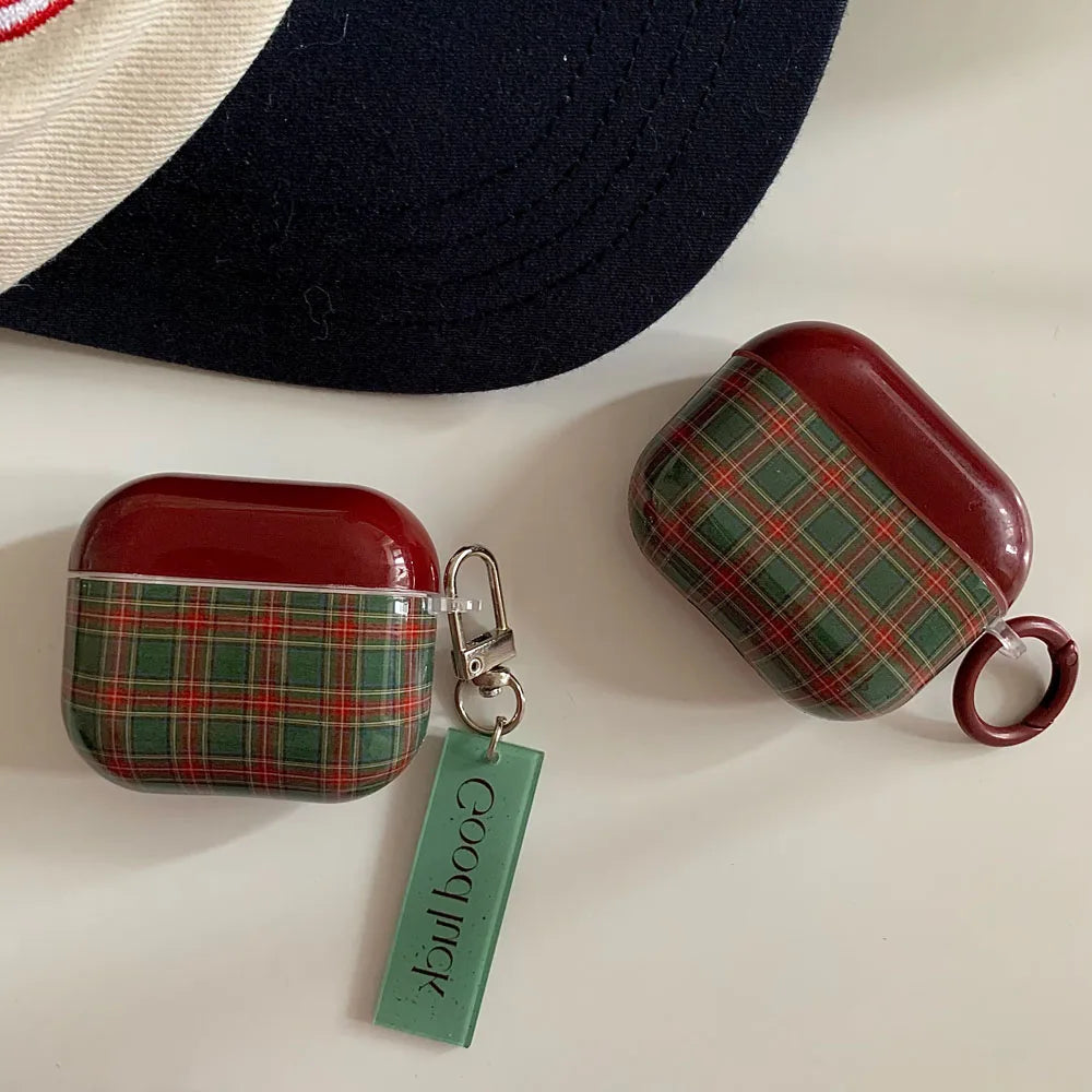 Qfdian Retro Style Grid Pattern Gloss Soft Cover Case for AirPods 4/3/2/1 Pro 2 Wireless Bluetooth Earphone Shell Good Lucky Pendant