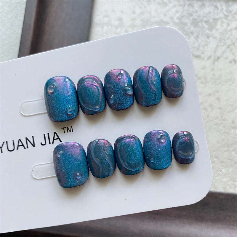 Qfdian Short Handmade Press on Nails Design Cat Eye Glitter False Nail Reusable Wearable Manicure Art Round Head Finger Tips Fake Nails