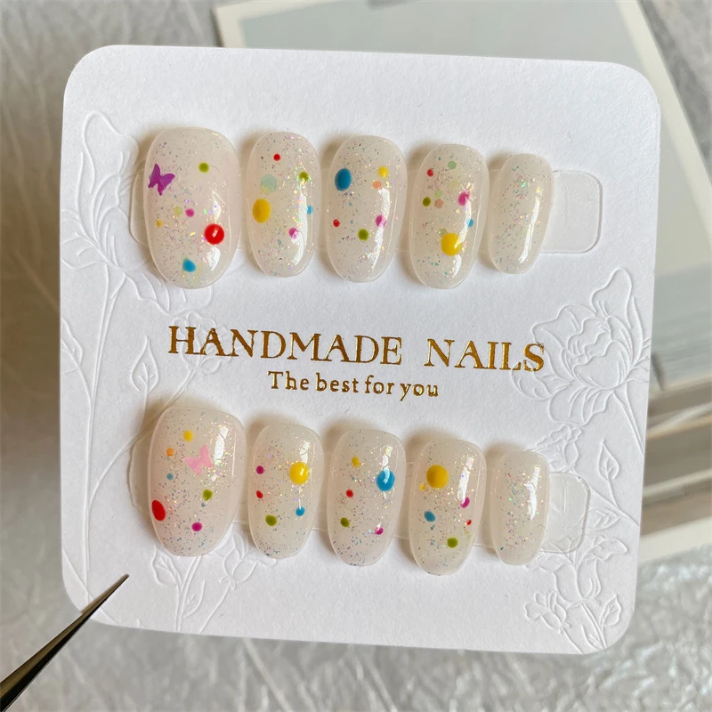 Qfdian Short Oval Press on Nails Handmade Fake Nails Full Cover Wearable False Reusable Adhesive Manicure Nails Glitter Dots Decoration