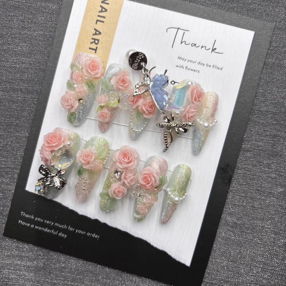 Featuring a sweet, fresh flower - fairy style. Light pink roses pair with dreamy butterflies, pearls, rhinestones, etc. Gradient blending and glitter effects create a romantic spring - garden atmosphere, making fingertips exude gentle fairy - like charm.