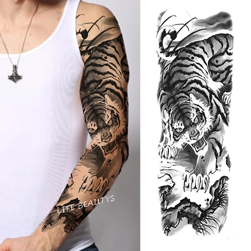 Qfdian Waterproof Full Arm Temporary Tattoo Sticker Tiger Lion Wolf Eye For Man Women Body Art Sleeve Flash Fake Shoulder Tatoo