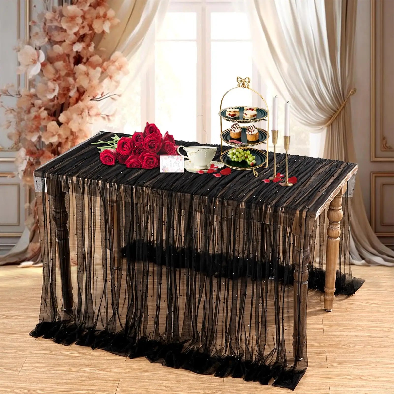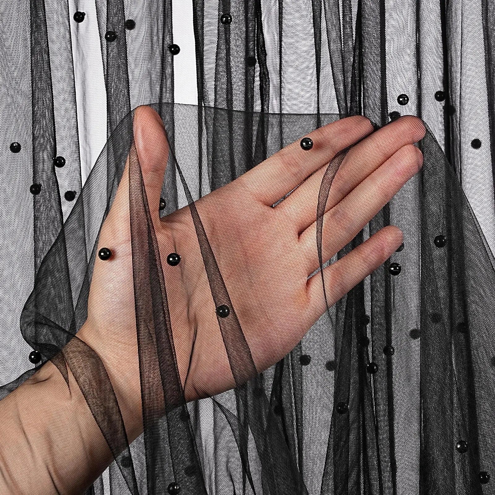 【Size】This tulle is embellished with pearl beads throughout the fabric, giving it a captivating glow, especially in the light. The fabric width is 155cm and is a fixed size.