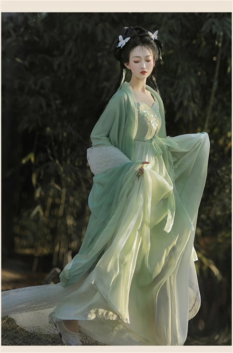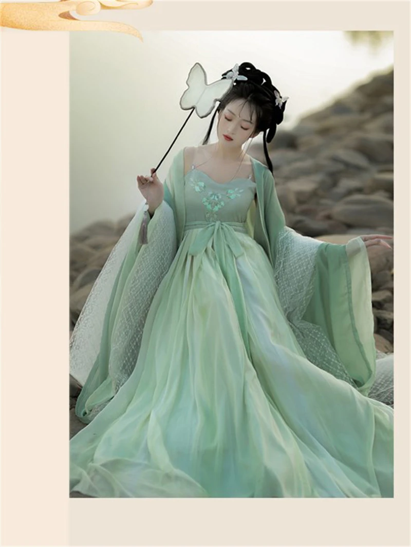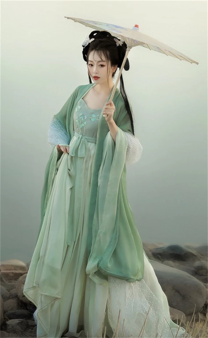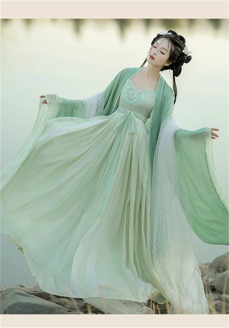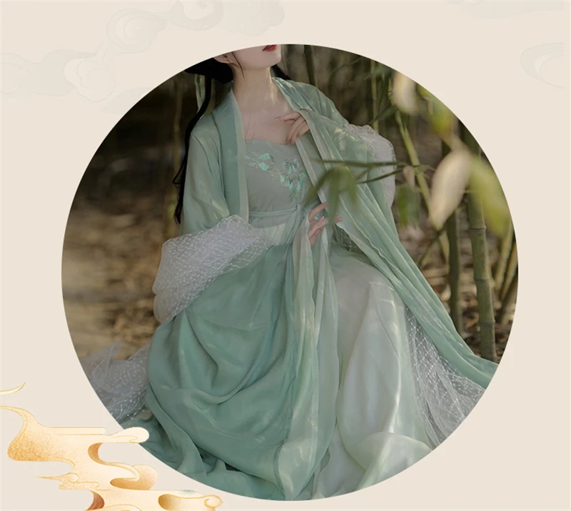 Women's Chinese Traditional Hanfu Weijin Dynasty Retro Loose Original Hanfu China Style Dress Green Chiffon Embroidered Dresses