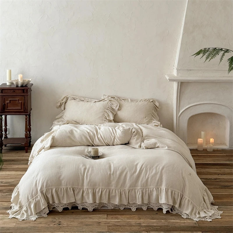 Qfdian 20% Linen And 80% Cotton Double Layer Lace Ruffles Vintage French Bedding Set Duvet Cover Flat/Fitted Bed Sheet Pillowcases 4Pcs