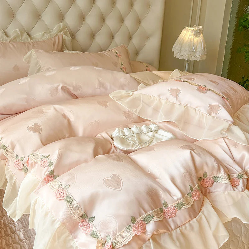 Qfdian 4Pcs Pure Cotton French Flowers Lace Ruffles Princess Wedding Bedding Set Duvet Cover Quilted Bedspread Bed Skirt Pillowcases