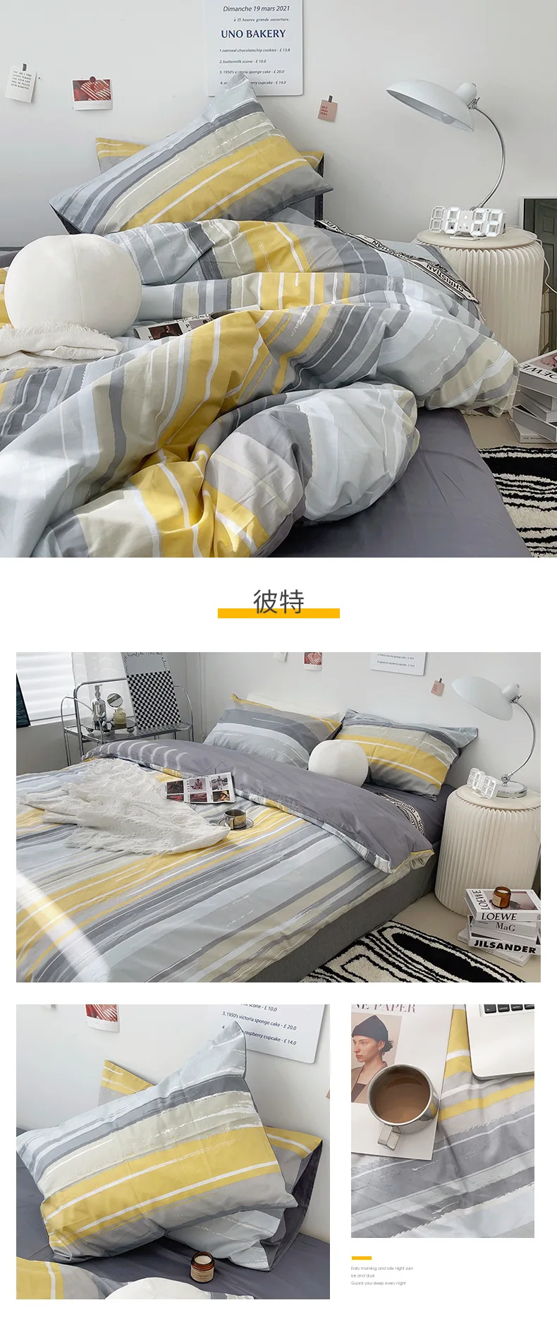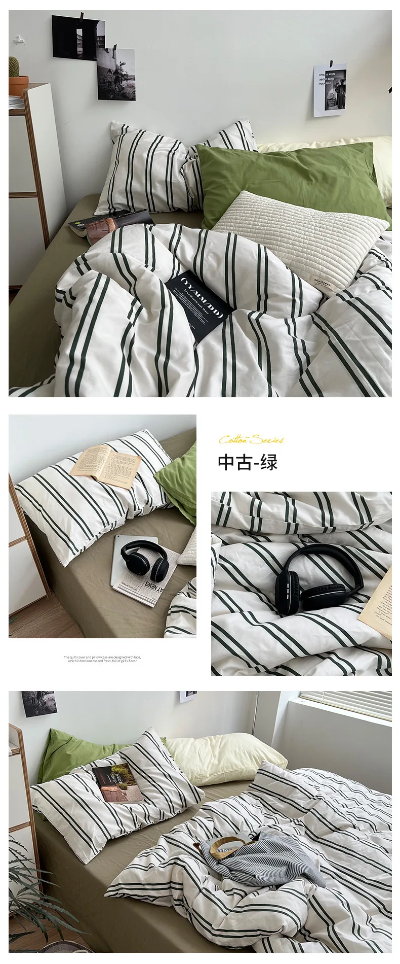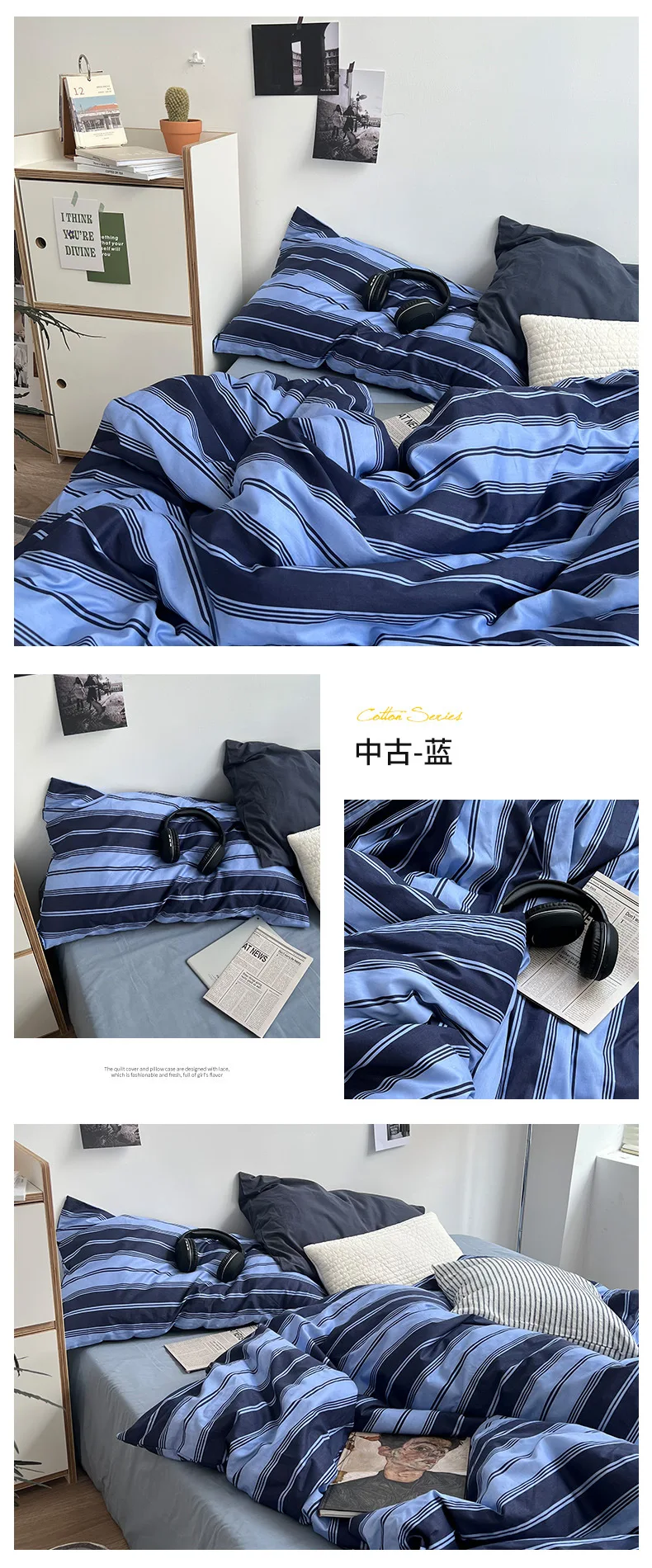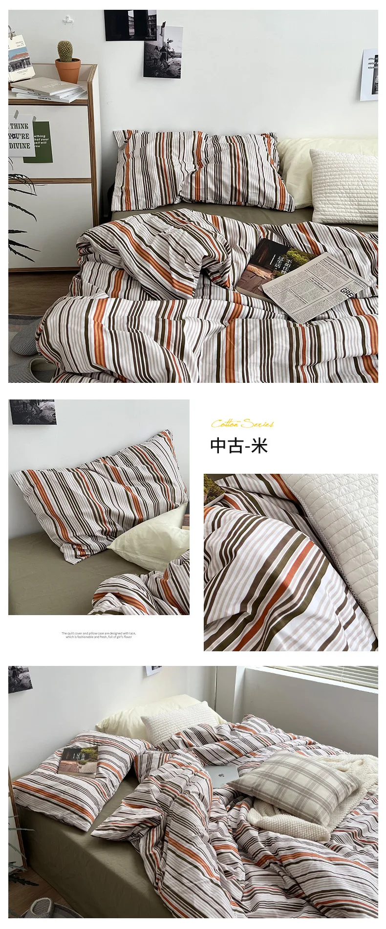 Qfdian Classic Stripes Bedding Set Soft Pure Cotton Breathable Flat Sheet Duvet Cover Pillowcases Single Queen Size Dormitory Bed Linen