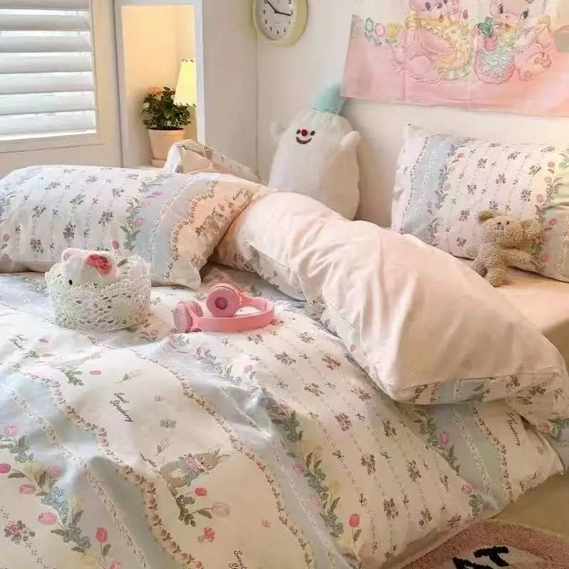 Qfdian Ins Korean Pastoral Flower Bedding Set Purple Bed Flat Sheet Pillowcase Twin Full Queen Size Bed Linen Women Girls Duvet Cover