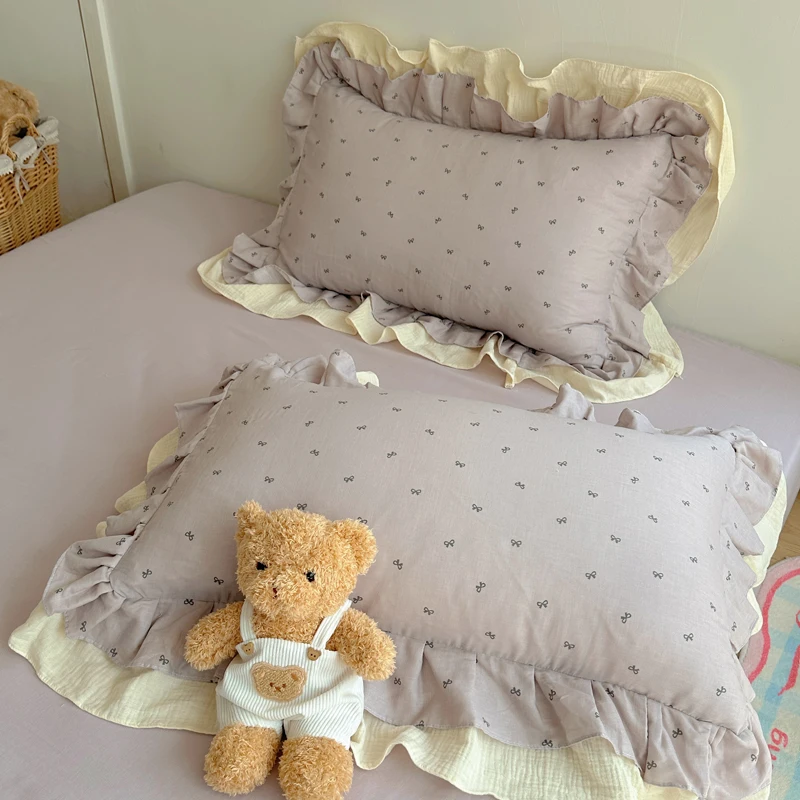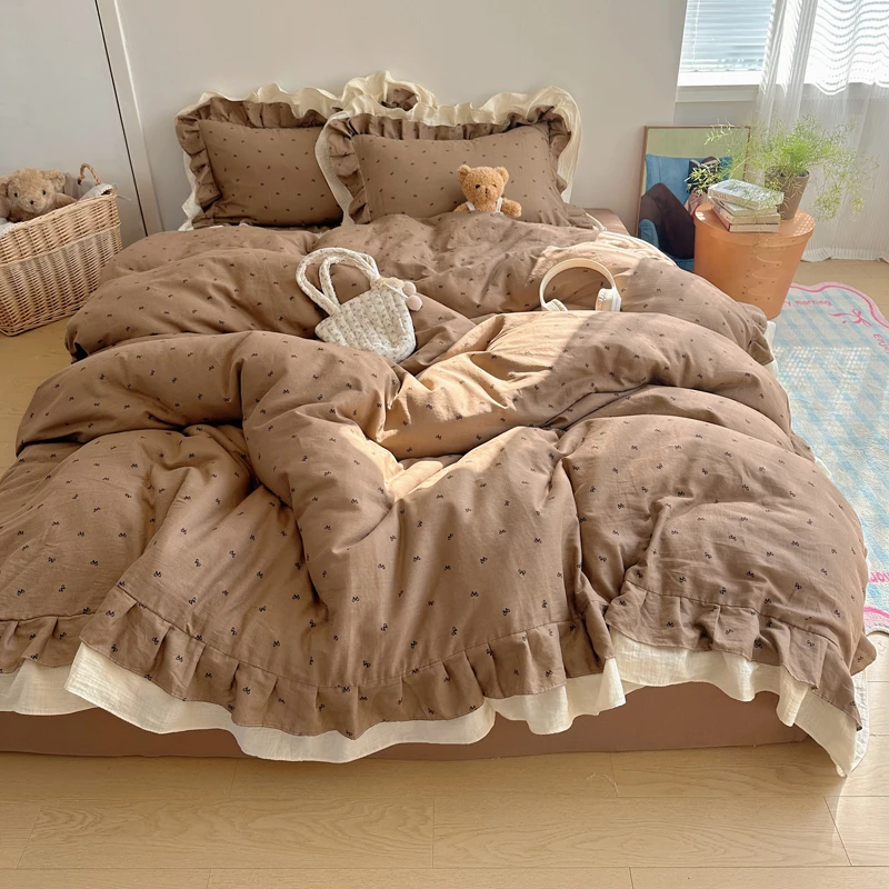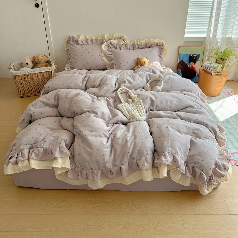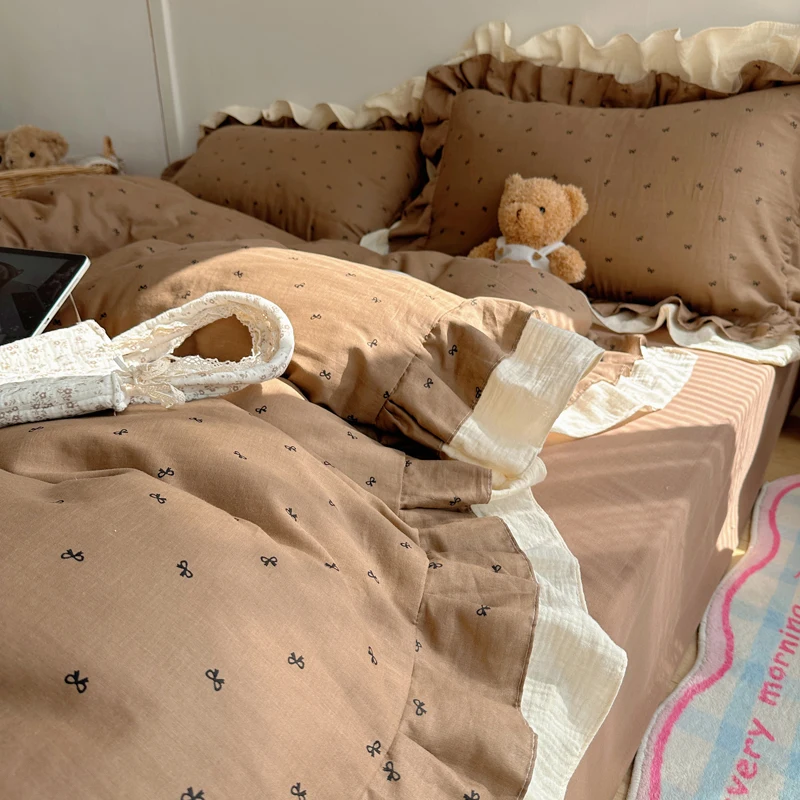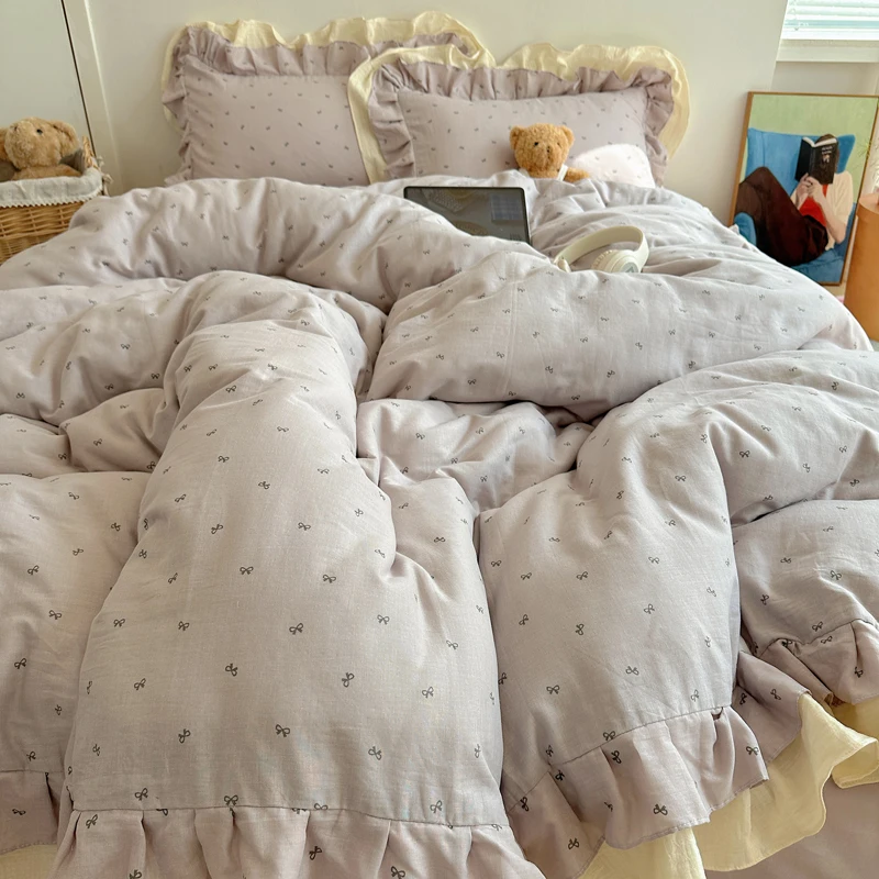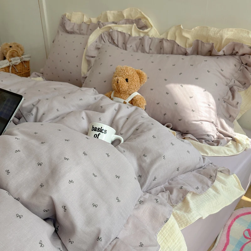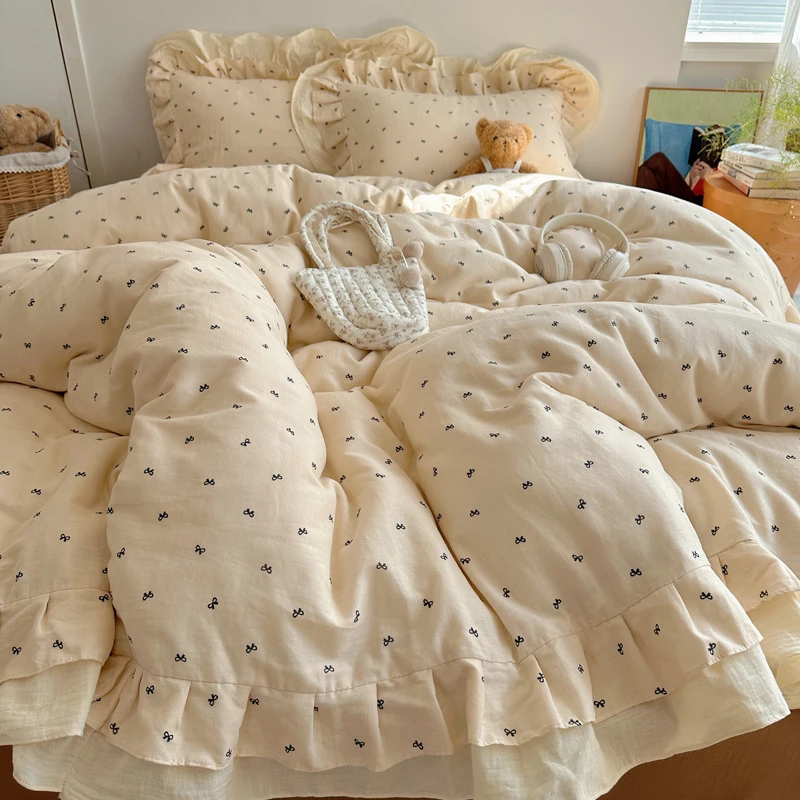 Qfdian Korean Princess Style Bed Linen Set Bowknot Print Ruffles Duvet Cover Pillowcase Bedsheet Bedclothes Home Soft Bedding Set