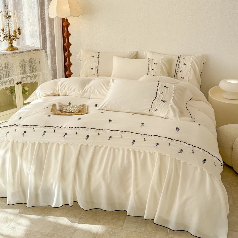 Qfdian Korean Princess Style Lace Ruffles Rose Embroidery Wedding Bedding Set Duvet Cover Set Flat/Fitted Bed Sheet Pillowcases 4Pcs