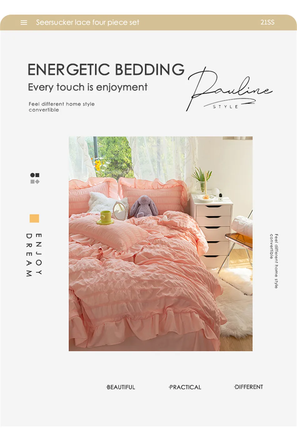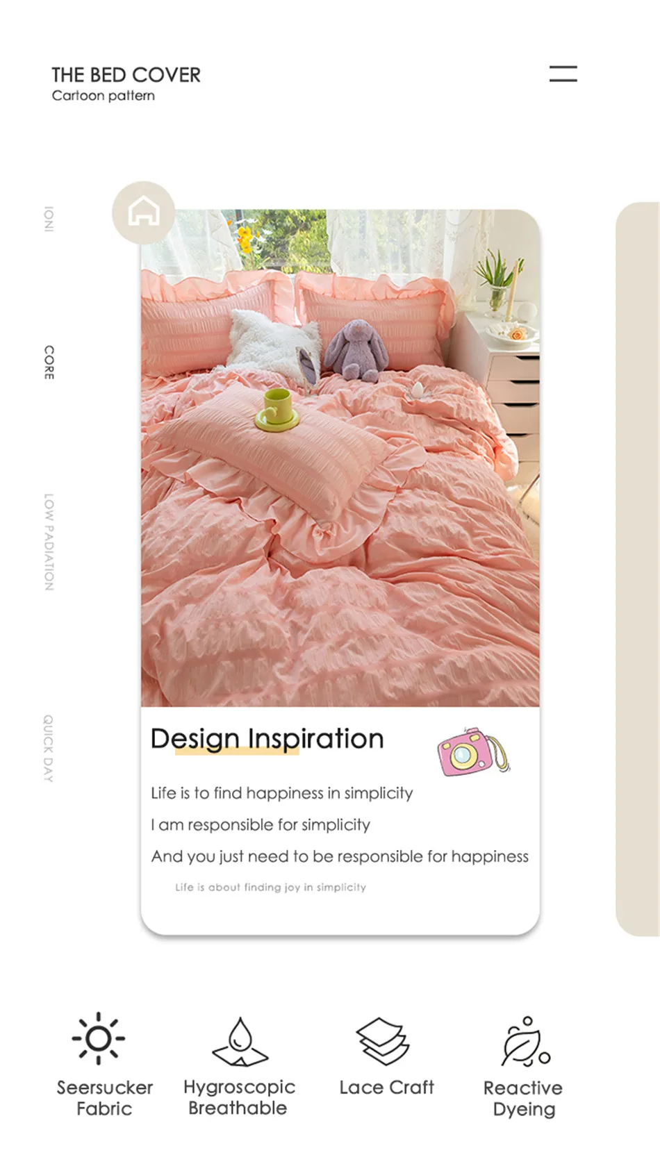 1. This bedding set is designed with seersucker. It's surface is covered with all over puckered/ ruched finish.It seems modern and gives a feeling of relaxation.It allows you to relax while following the tight pace of modern life.