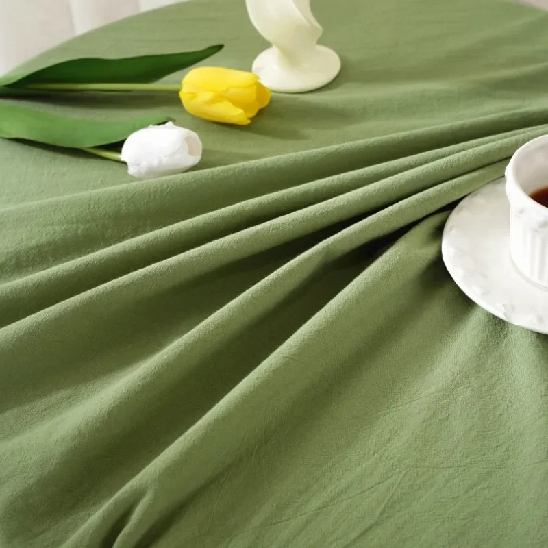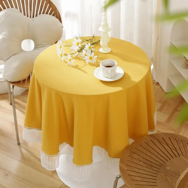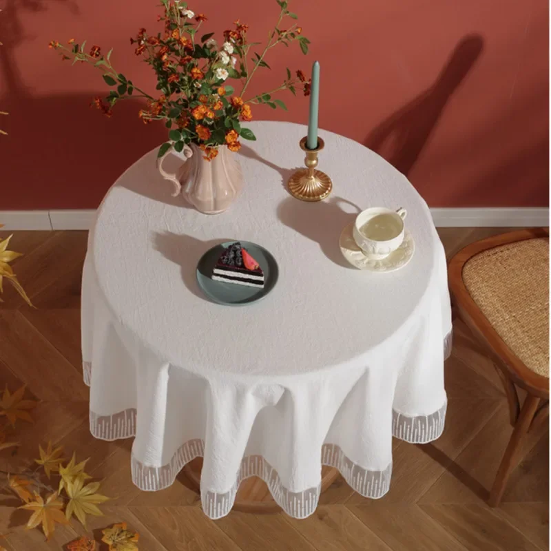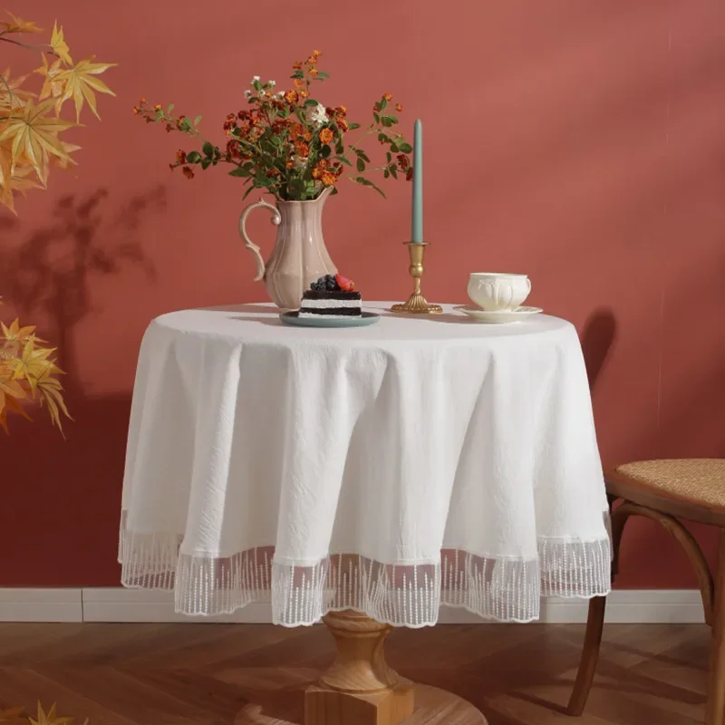 Qfdian Round Tablecloth with Elegant Lace Edge Cotton Fabric Kitchen Decor Party Grace Table Decoration Dustproof Machine Washable
