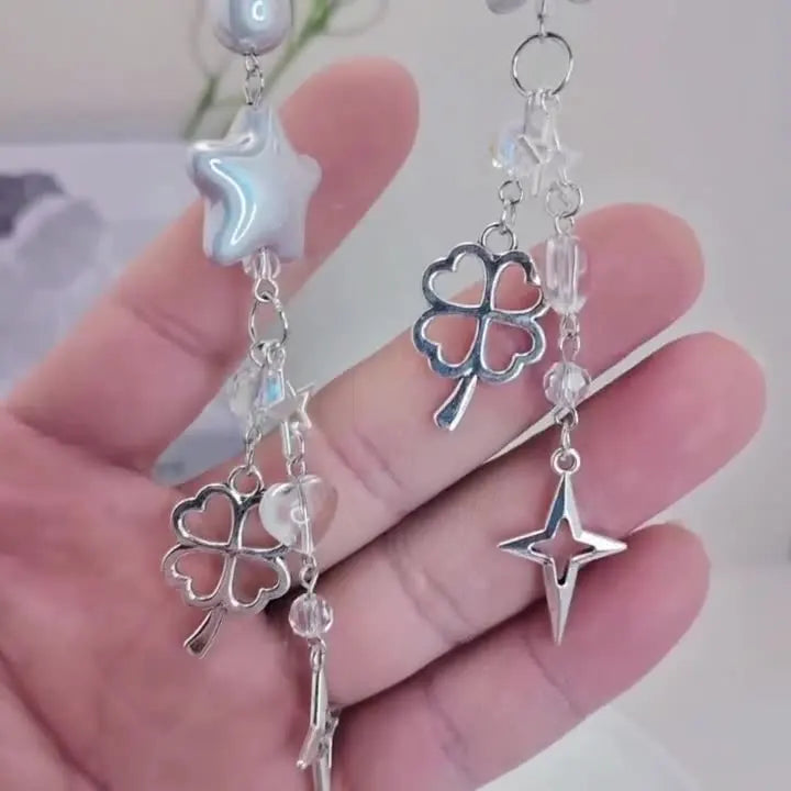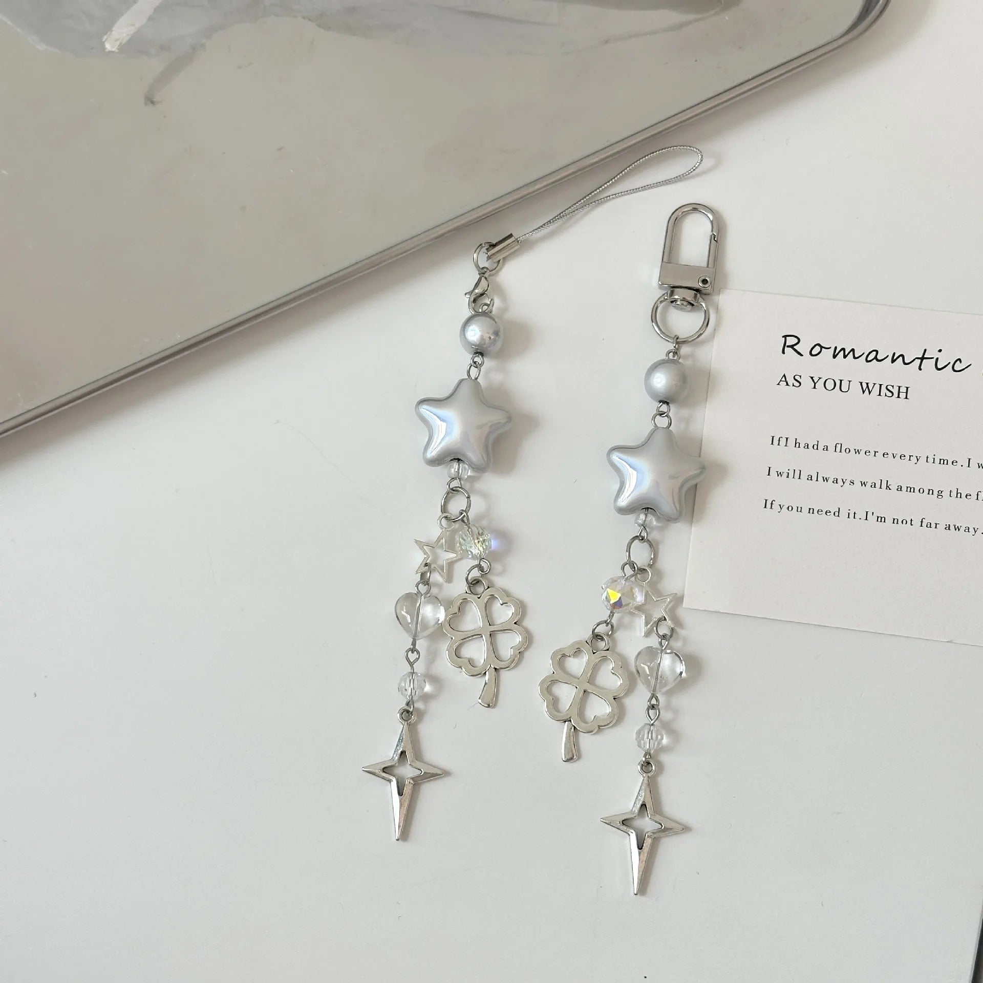Qfdian 3D Star Clover Beaded Charm Phone Pendant Crystal Wristband Keychain Bracelet Lanyard Cord
