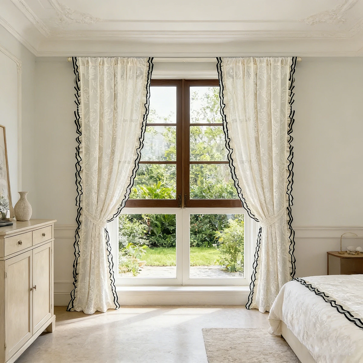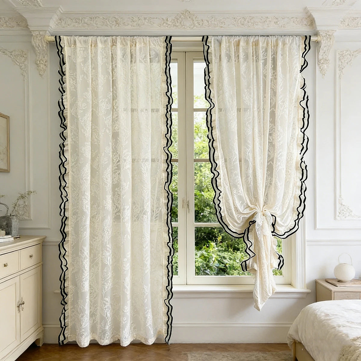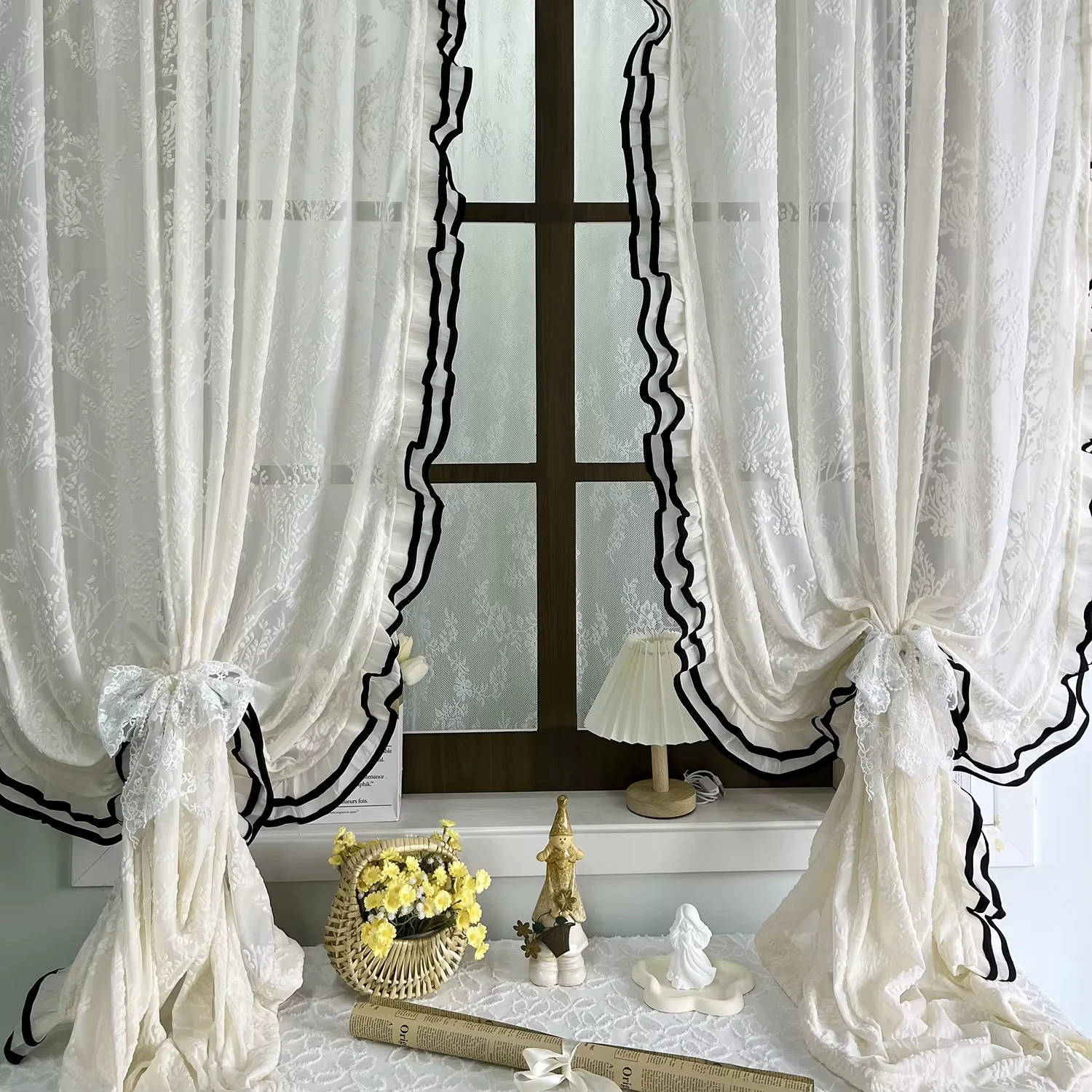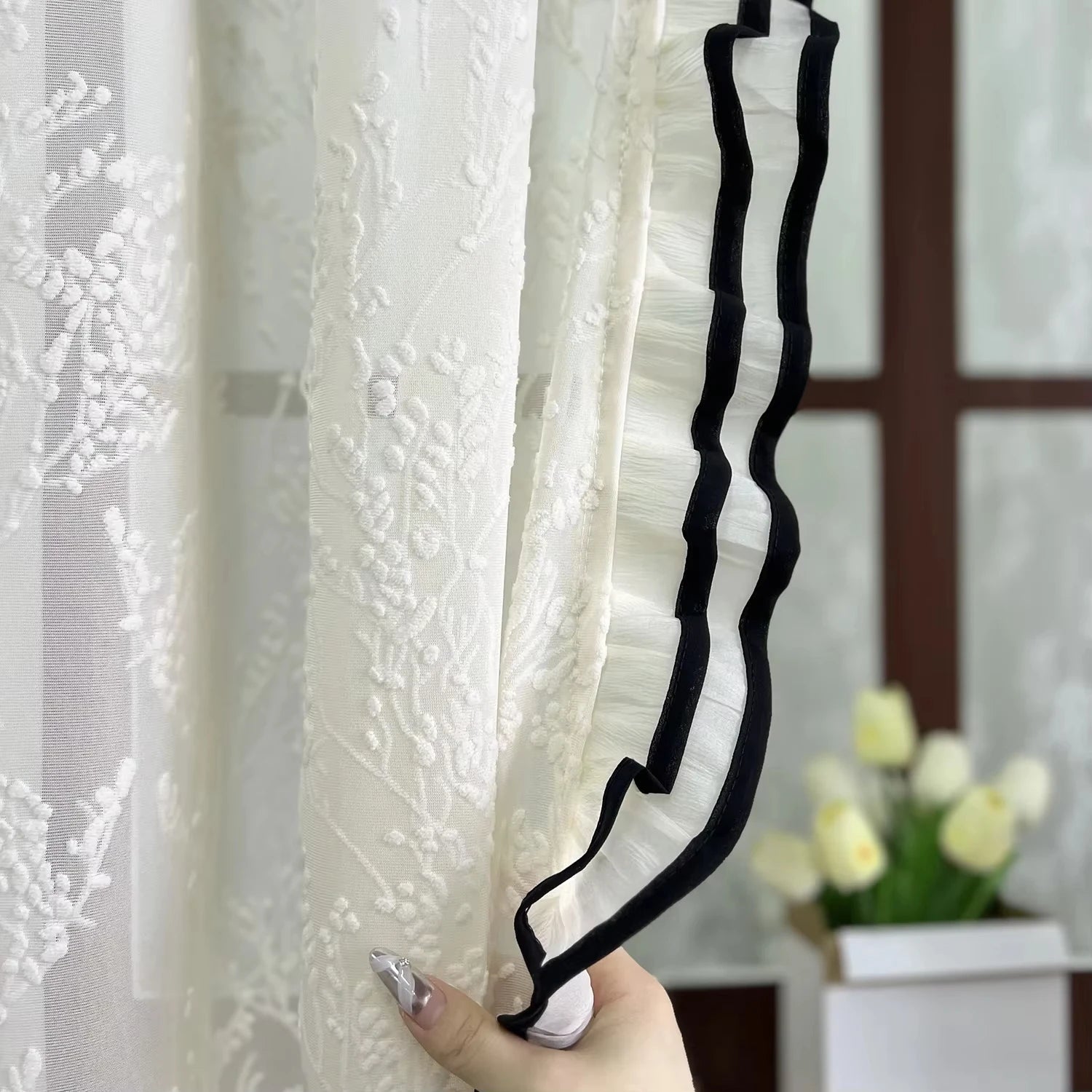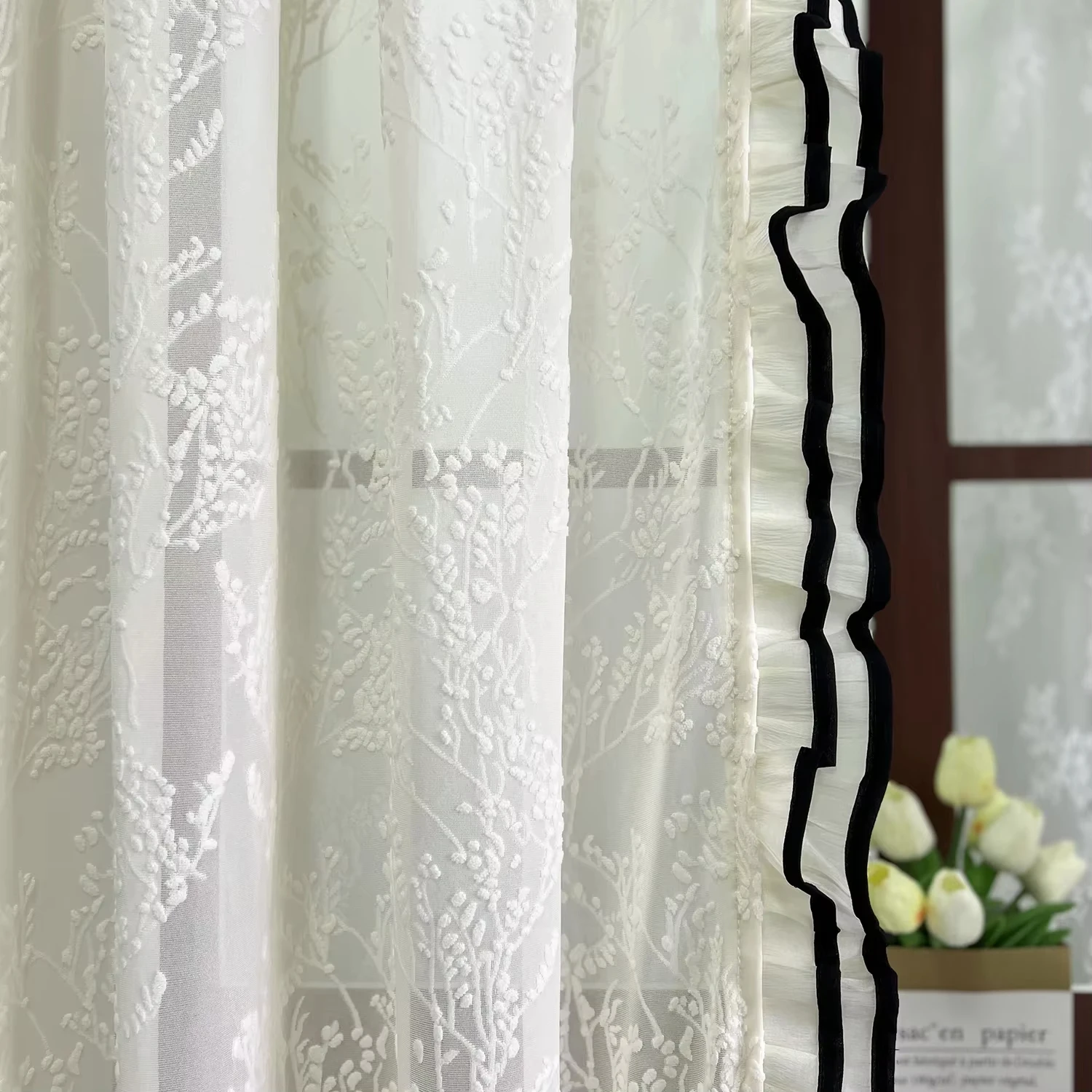 Qfdian Cream Style Velvet Pole Twig Pattern with Black Ruffled Lace Trim Unique Design Opaque Tulle Curtains For Bedroom Living Room