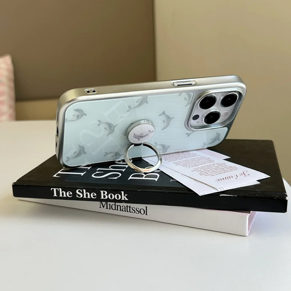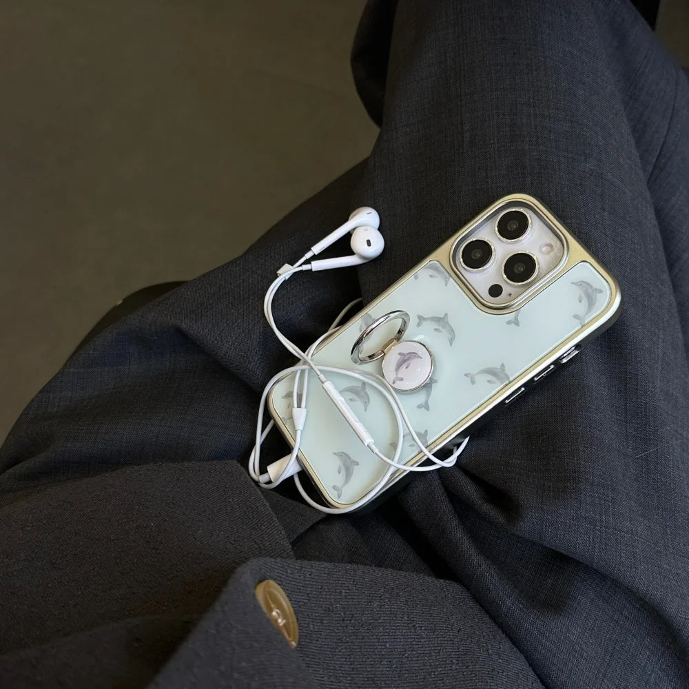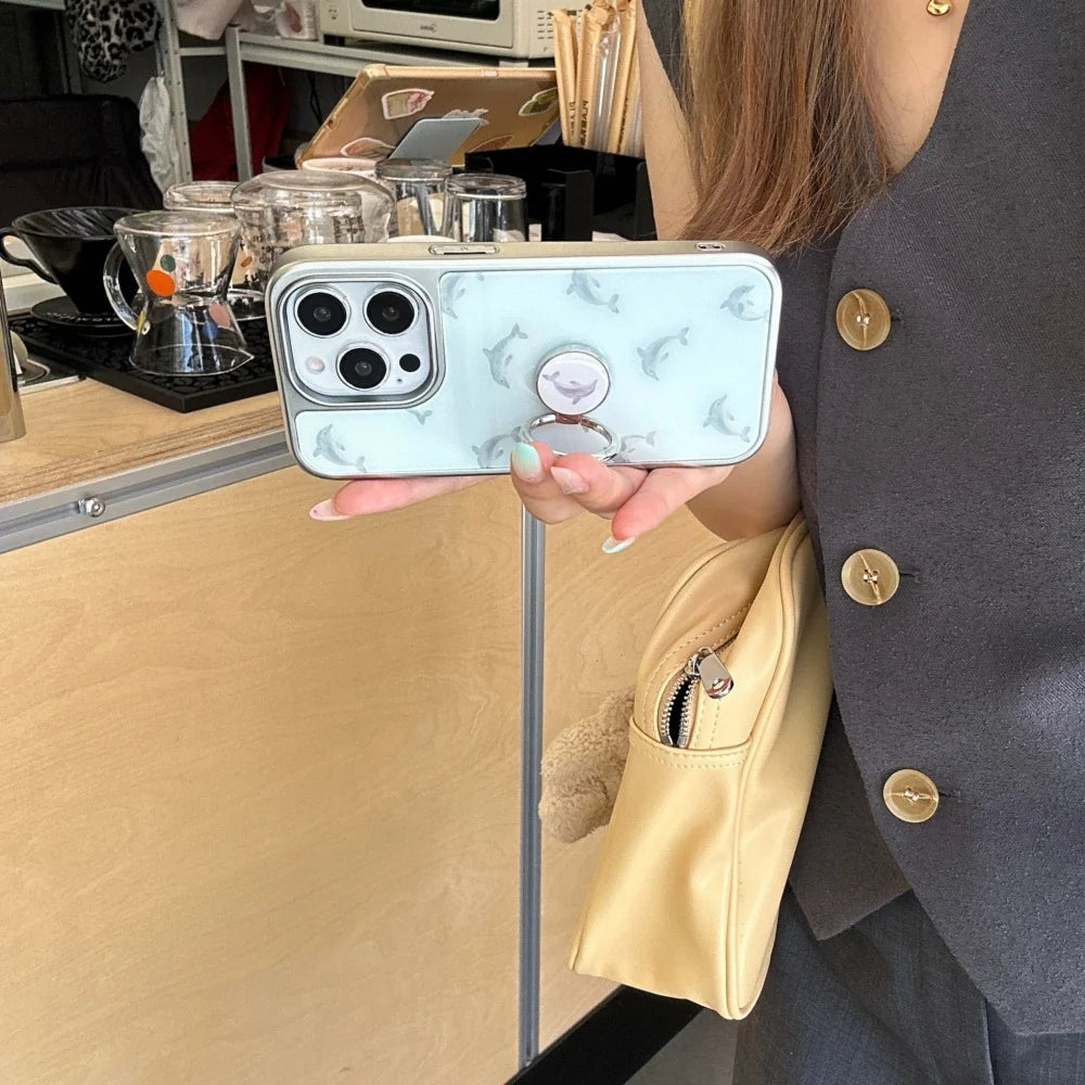 Qfdian Cute niche blue bottom dolphin ring bracket is suitable for Apple 16promax mobile phone case iPhone15pro new model