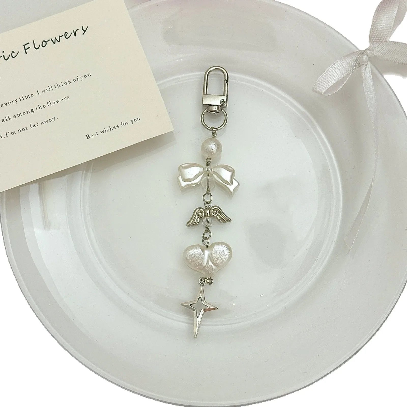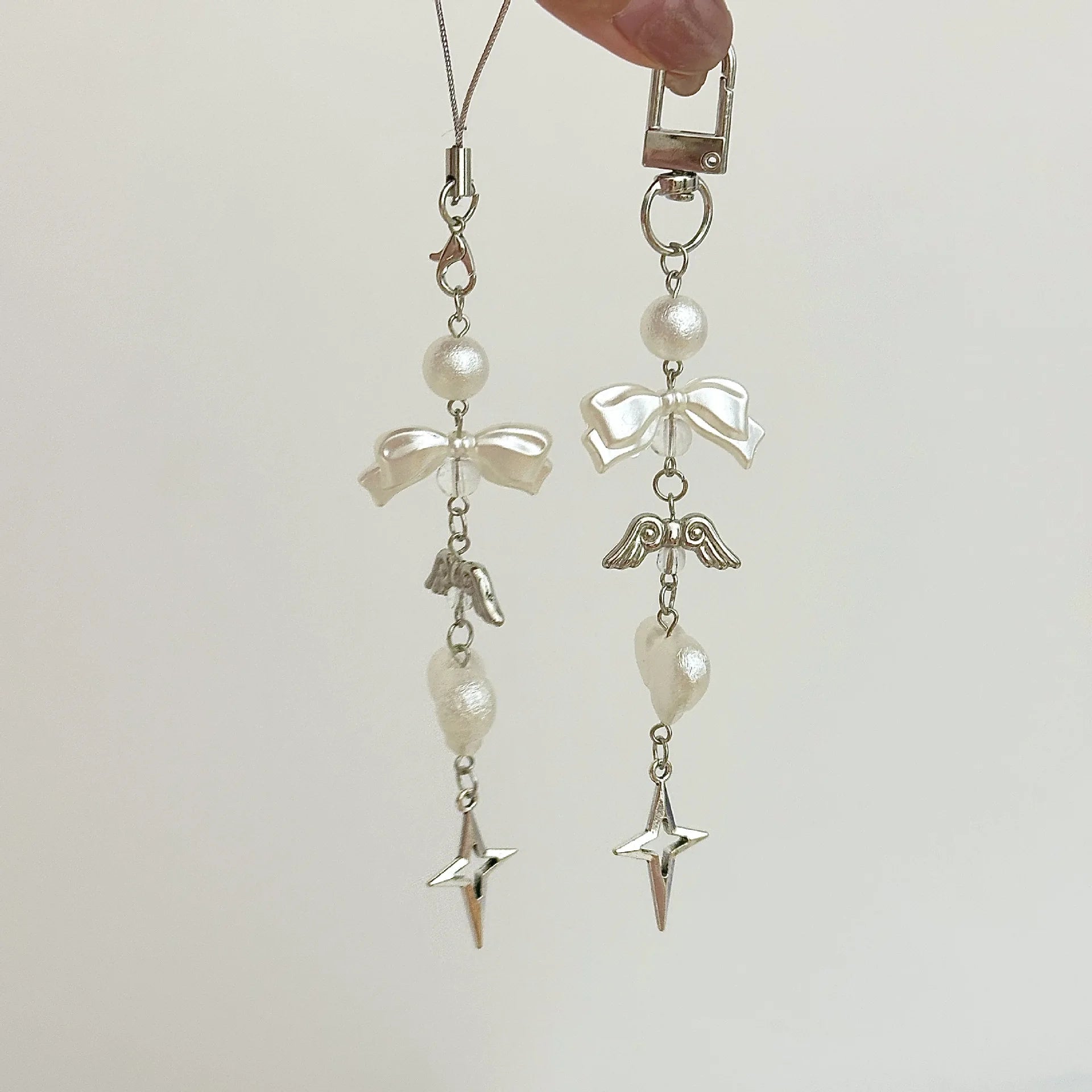 Qfdian INS Korea Pearl Bow Knot Heart Charm Phone Pendant Crystal Wristband Keychain Bracelet Lanyard Cord