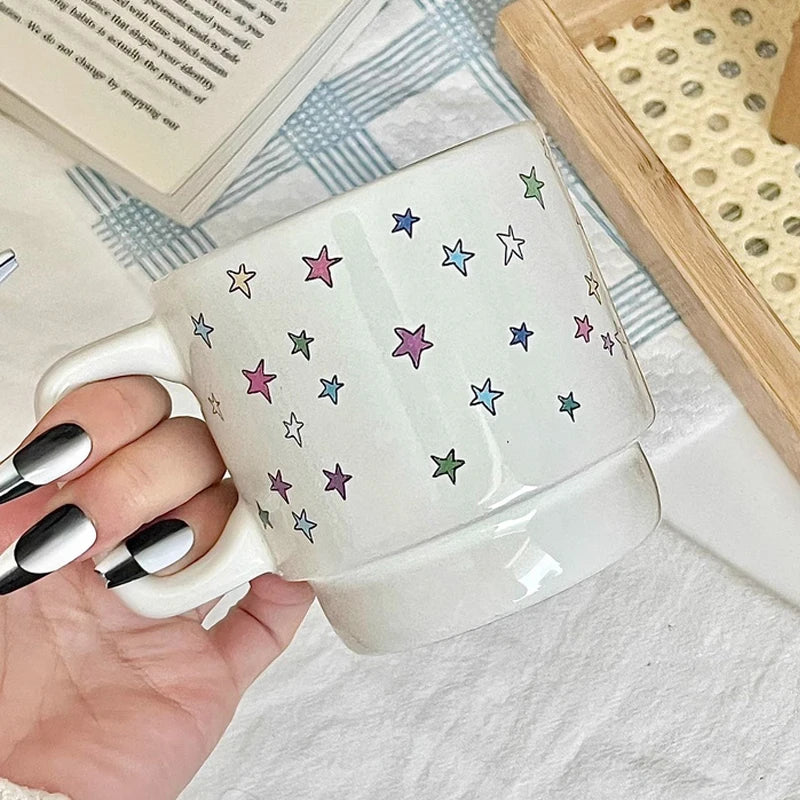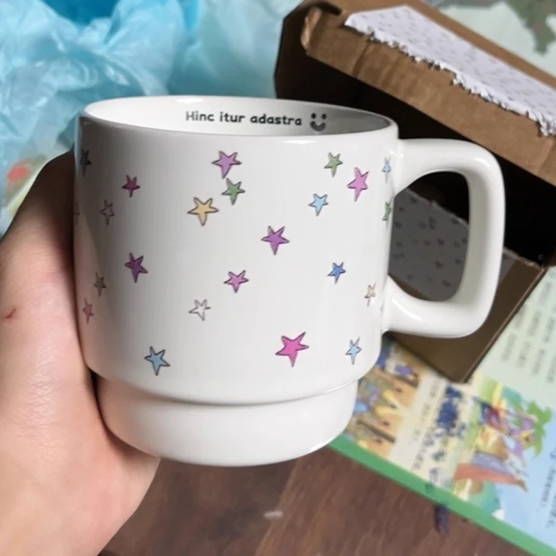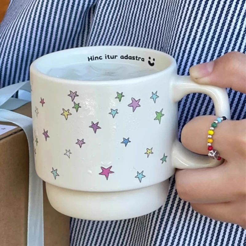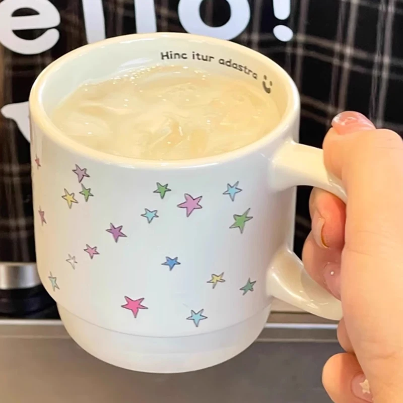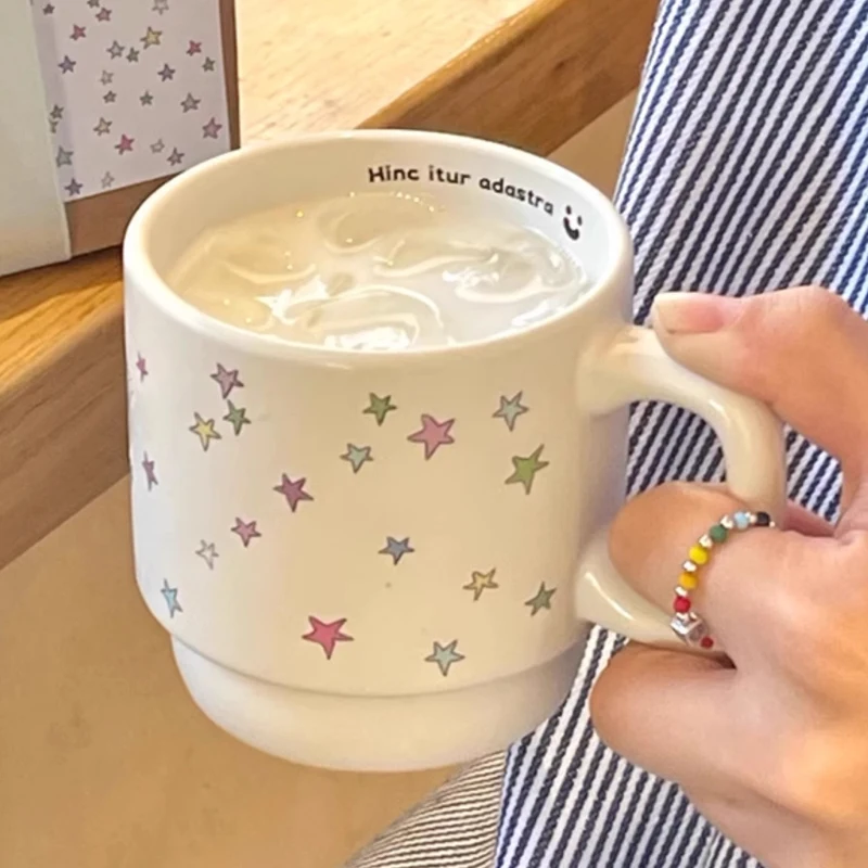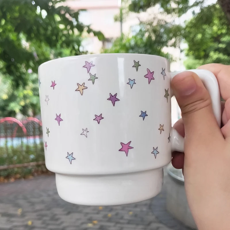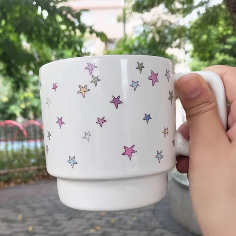 Qfdian Creative Colorful Five-pointed Star Pattern Water Cups Household Office Items Porcelain White Mug Breakfast Milk Coffee Cup, 1Pc